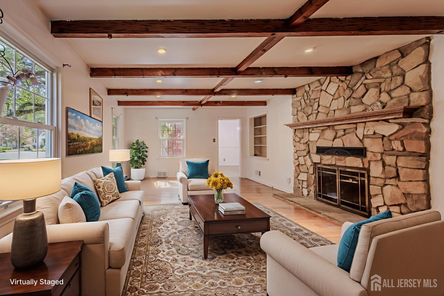 Welcome to this inviting 4-bedroom home, where homeowners benefit from the highly regarded East Brunswick school system. From the moment you step into the bright and welcoming foyer, you'll be drawn into a beautiful living room filled with warmth and character. A gas fireplace framed by a striking beamed ceiling and gleaming hardwood floors creates the perfect centerpiece, offering both comfort and style. Just off the living room, a formal dining room offers the perfect setting for gatherings and celebrations. The spacious eat-in kitchen is the true heart of the home, complete with its own cozy fireplace and rustic beamed ceiling, creating a warm and welcoming space for everyday living. Gleaming hardwood floors enhance the first level. With four generous bedroomstwo on the main floor and two upstairsplus a full bath on each level both with tub and shower, the layout is flexible and practical. Outdoors, enjoy your private fenced yard, ideal for relaxing or entertaining. Modern touches include an upgraded electrical system ready for your electric car CJMLS 2604404R