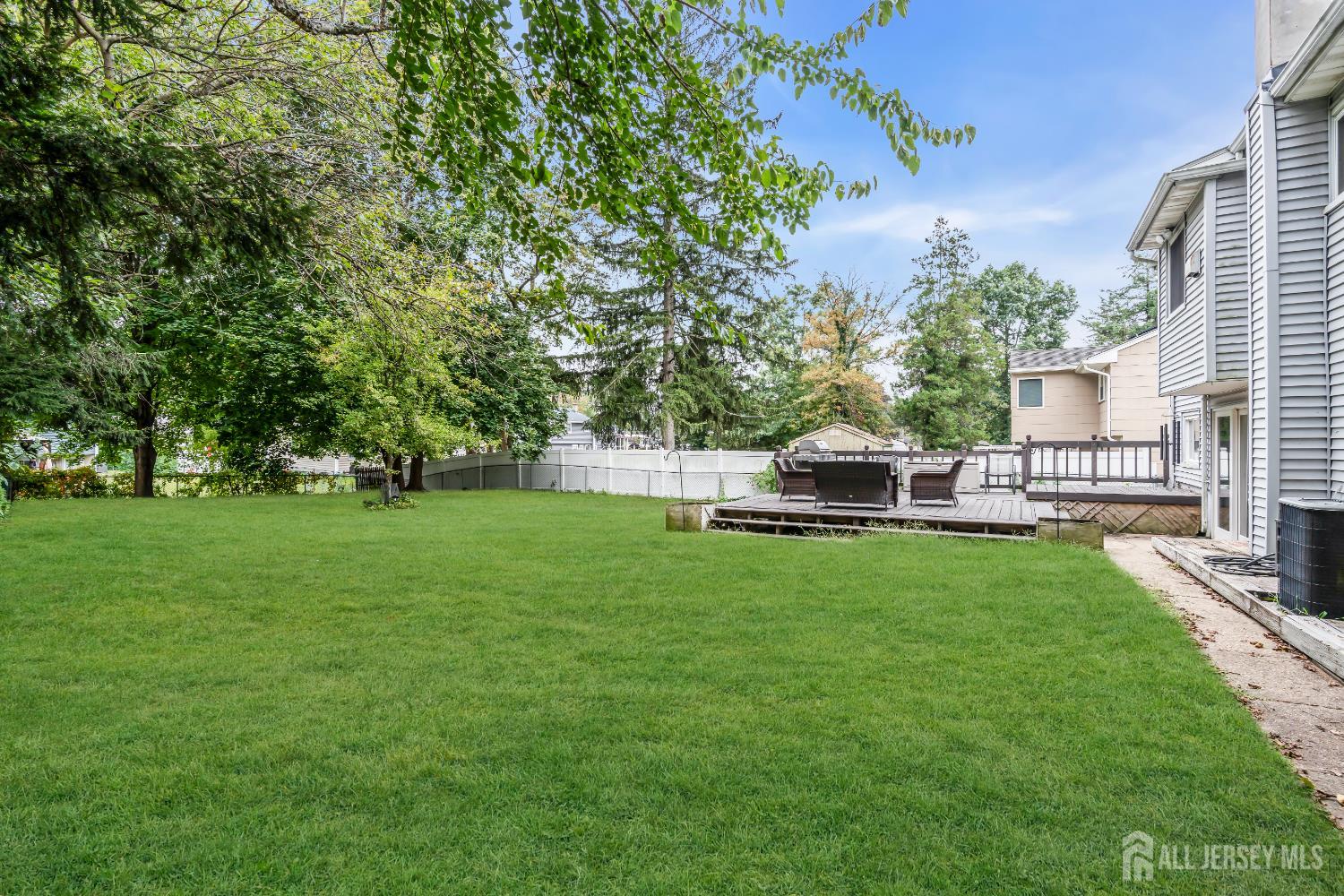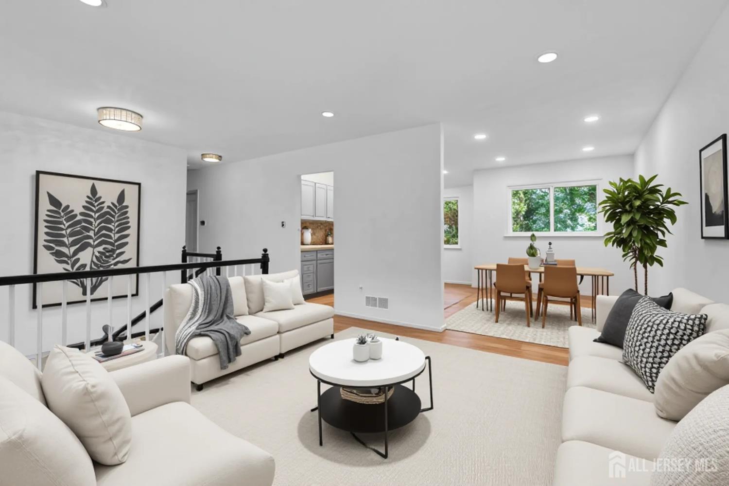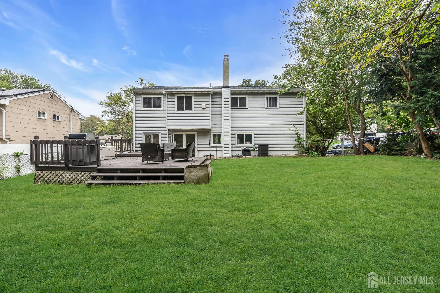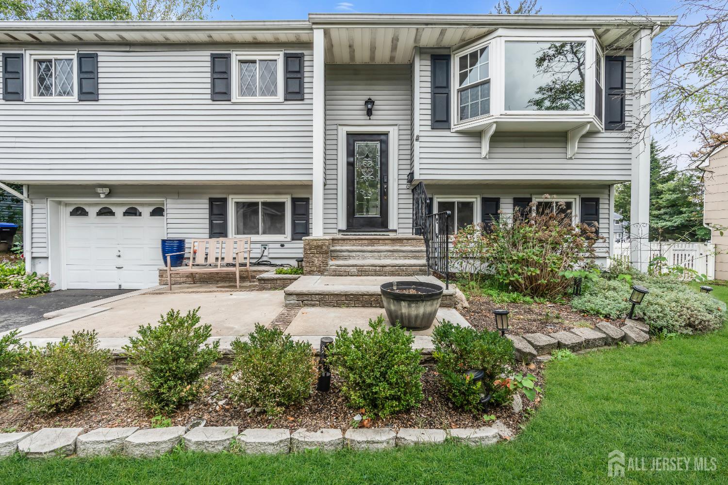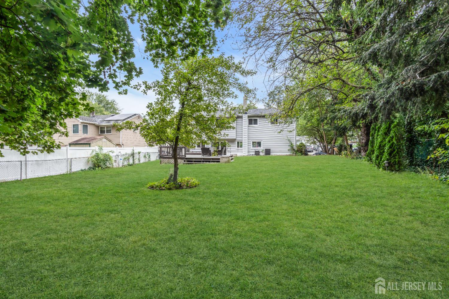 Welcome to this well-maintained 4-bedroom, 1.5-bath, 2-level home situated on a fenced, nearly one-third-acre lot, featuring a spacious deck ideal for entertaining or simply relaxing in your own private outdoor retreat. A dramatic 2-story entrance with a striking beveled-glass door and updated flooring sets the tone, opening to sun-filled spaces with hardwood floors. The interior has been freshly painted throughout, creating a bright, move-in-ready feel. Upstairs, the updated kitchen features stainless steel appliances, painted wood cabinets with new hardware, and new flooring. Thoughtfully open to the dining room, it flows seamlessly into the living room, which features a whole wall bay window, making it an ideal setup for gatherings. Three bedrooms and a refreshed full bath, featuring new flooring and a mirror, are complemented by 2-paneled doors with custom hardware, recessed lighting, fans, and pull-down attic stairs, making this level complete. The lower level is designed with flexibility in mind ideal for extended families or for enjoying entirely on your own. This level features an additional bedroom, a half bath, a spacious family room with French door sliders that open to the deck and great yard, a den, a laundry room, garage access, recessed lighting, and 6-panelled doors with custom hardware. With separate entrances and living areas, this home is ideal for extended family living. Added highlights include a 2022 new roof with all-new plywood and a 50-year warranty, a maintenance-free vinyl exterior, numerous recessed lights throughout, a spacious deck, and a beautiful property setting. Conveniently located near NY transportation, this home also enjoys East Brunswick's highly rated schools, shopping, fine dining, local theatre, nearby Princeton and Rutgers, and all the amenities that make East Brunswick such a desirable community. Virtually enhanced. CJMLS 2605093R