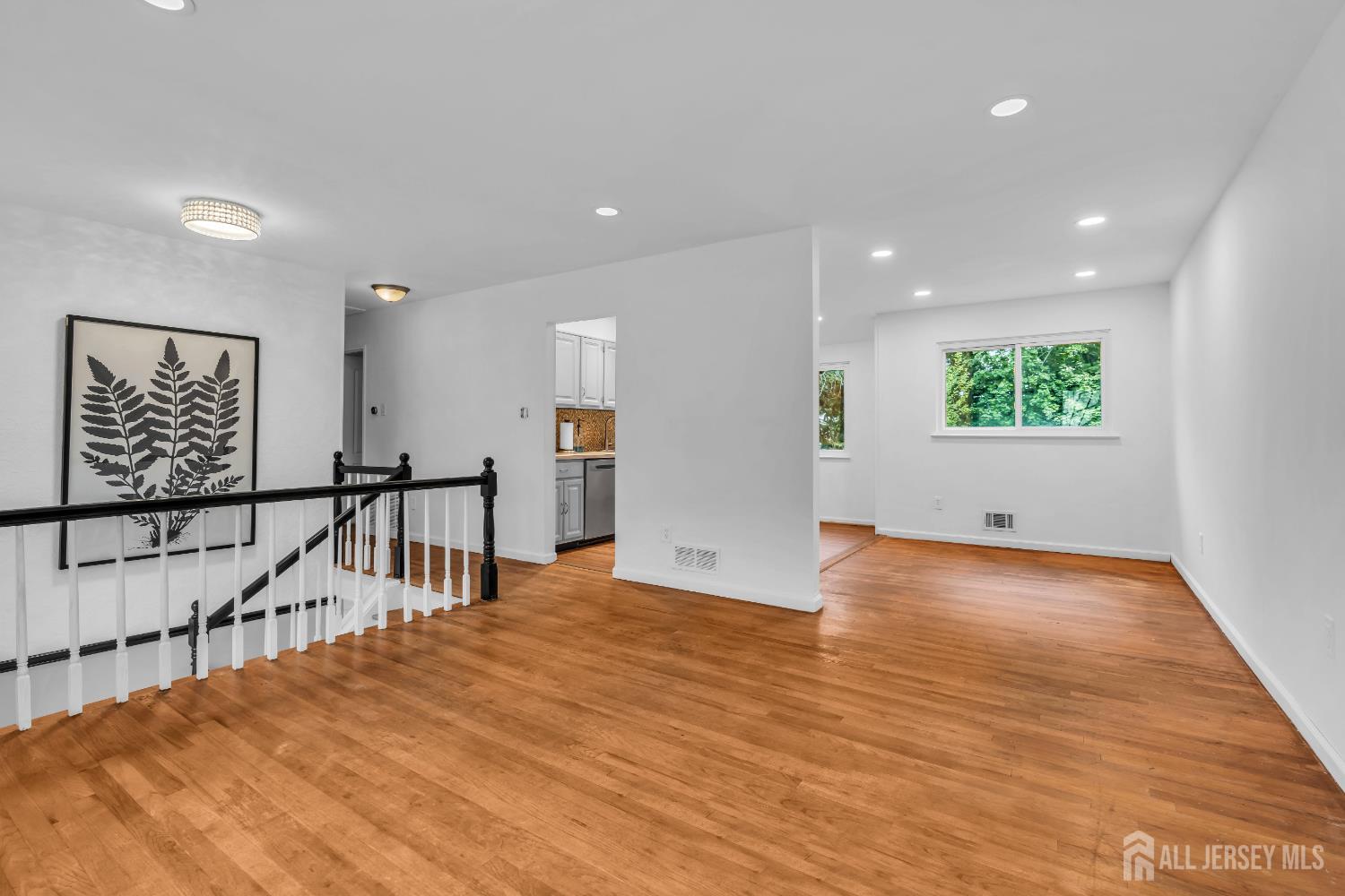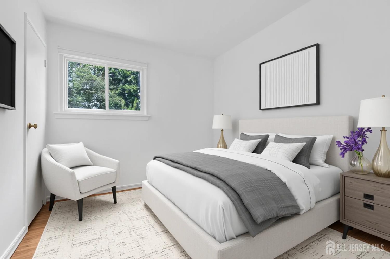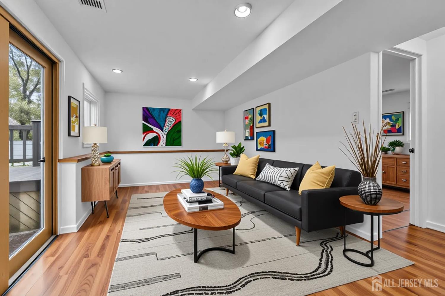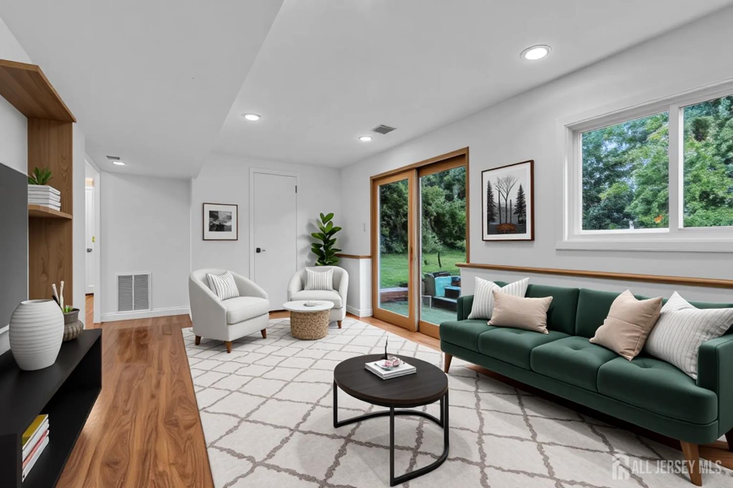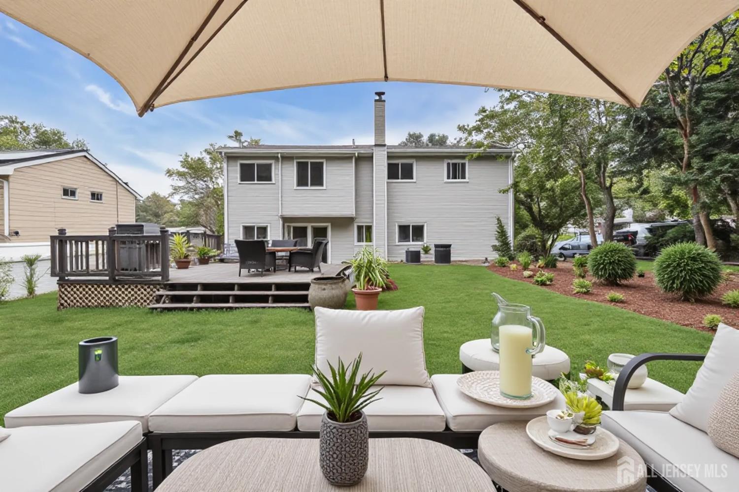 Welcome to this well-maintained 4-bedroom, 1.5-bath, 2-level home situated on a fenced, nearly one-third-acre lot, featuring a spacious deck ideal for entertaining or simply relaxing in your own private outdoor retreat. A dramatic 2-story entrance with a striking beveled-glass door and updated flooring sets the tone, opening to sun-filled spaces with hardwood floors. The interior has been freshly painted throughout, creating a bright, move-in-ready feel. Upstairs, the updated kitchen features stainless steel appliances, painted wood cabinets with new hardware, and new flooring. Thoughtfully open to the dining room, it flows seamlessly into the living room, which features a whole wall bay window, making it an ideal setup for gatherings. Three bedrooms and a refreshed full bath, featuring new flooring and a mirror, are complemented by 2-paneled doors with custom hardware, recessed lighting, fans, and pull-down attic stairs, making this level complete. The lower level is designed with flexibility in mind ideal for extended families or for enjoying entirely on your own. This level features an additional bedroom, a half bath, a spacious family room with French door sliders that open to the deck and great yard, a den, a laundry room, garage access, recessed lighting, and 6-panelled doors with custom hardware. With separate entrances and living areas, this home is ideal for extended family living. Added highlights include a 2022 new roof with all-new plywood and a 50-year warranty, a maintenance-free vinyl exterior, numerous recessed lights throughout, a spacious deck, and a beautiful property setting. Conveniently located near NY transportation, this home also enjoys East Brunswick's highly rated schools, shopping, fine dining, local theatre, nearby Princeton and Rutgers, and all the amenities that make East Brunswick such a desirable community. Virtually enhanced. CJMLS 2605093R