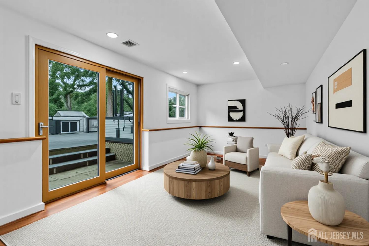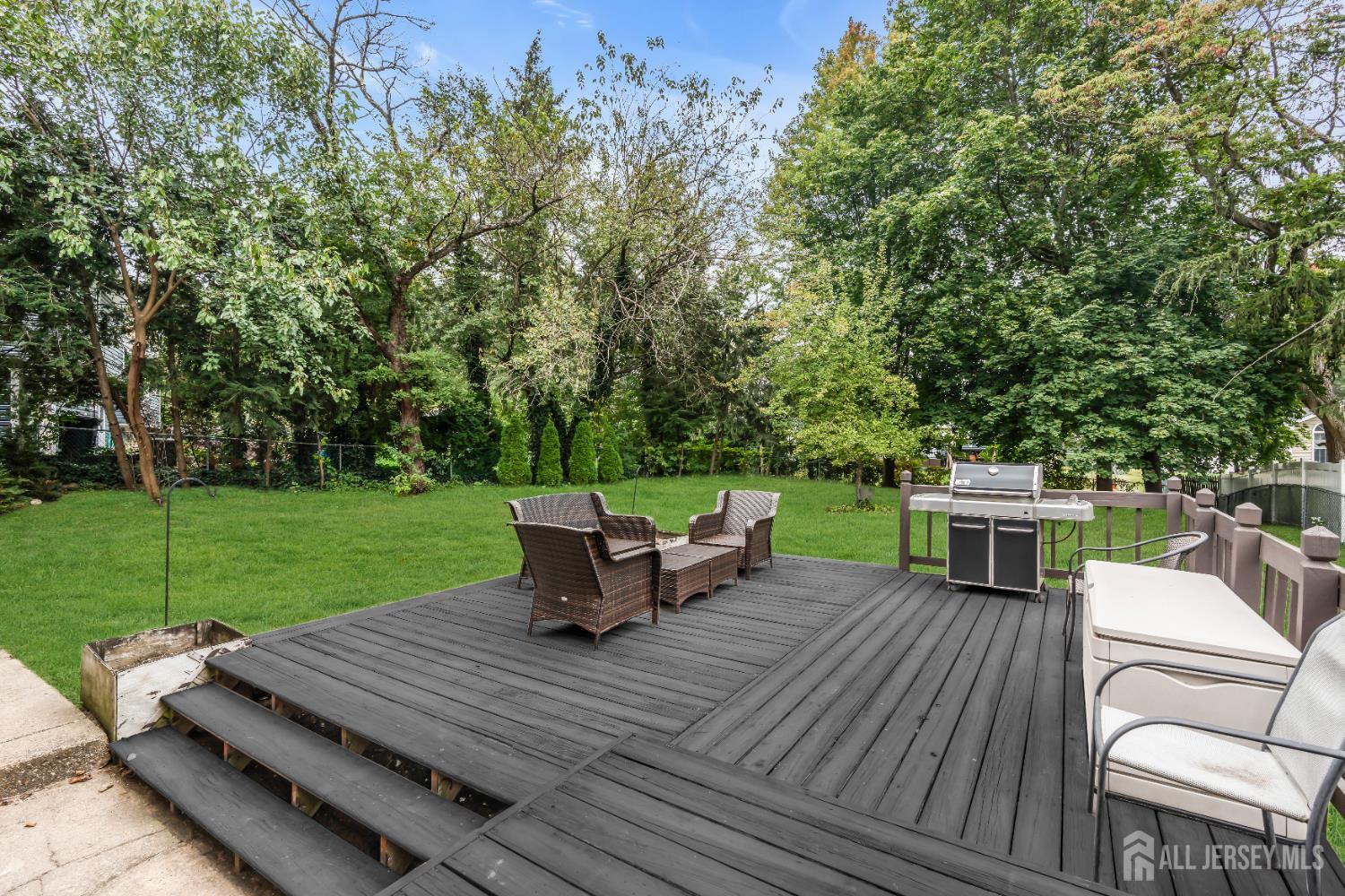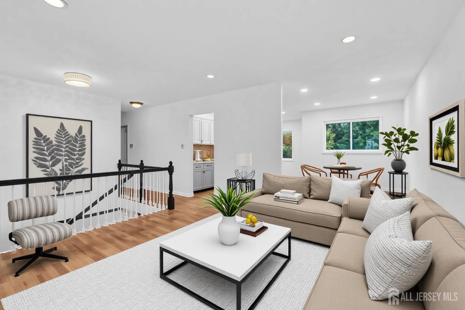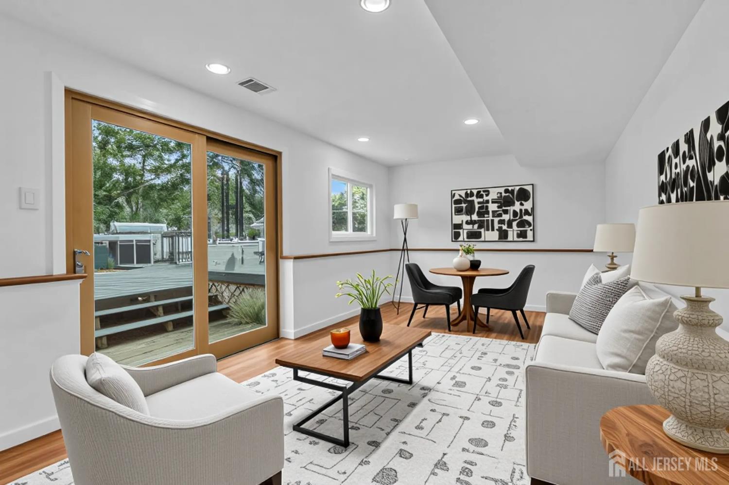 Welcome to this well-maintained 4-bedroom, 1.5-bath, 2-level home situated on a fenced, nearly one-third-acre lot, featuring a spacious deck ideal for entertaining or simply relaxing in your own private outdoor retreat. A dramatic 2-story entrance with a striking beveled-glass door and updated flooring sets the tone, opening to sun-filled spaces with hardwood floors. The interior has been freshly painted throughout, creating a bright, move-in-ready feel. Upstairs, the updated kitchen features stainless steel appliances, painted wood cabinets with new hardware, and new flooring. Thoughtfully open to the dining room, it flows seamlessly into the living room, which features a whole wall bay window, making it an ideal setup for gatherings. Three bedrooms and a refreshed full bath, featuring new flooring and a mirror, are complemented by 2-paneled doors with custom hardware, recessed lighting, fans, and pull-down attic stairs, making this level complete. The lower level is designed with flexibility in mind ideal for extended families or for enjoying entirely on your own. This level features an additional bedroom, a half bath, a spacious family room with French door sliders that open to the deck and great yard, a den, a laundry room, garage access, recessed lighting, and 6-panelled doors with custom hardware. With separate entrances and living areas, this home is ideal for extended family living. Added highlights include a 2022 new roof with all-new plywood and a 50-year warranty, a maintenance-free vinyl exterior, numerous recessed lights throughout, a spacious deck, and a beautiful property setting. Conveniently located near NY transportation, this home also enjoys East Brunswick's highly rated schools, shopping, fine dining, local theatre, nearby Princeton and Rutgers, and all the amenities that make East Brunswick such a desirable community. Virtually enhanced. CJMLS 2605093R