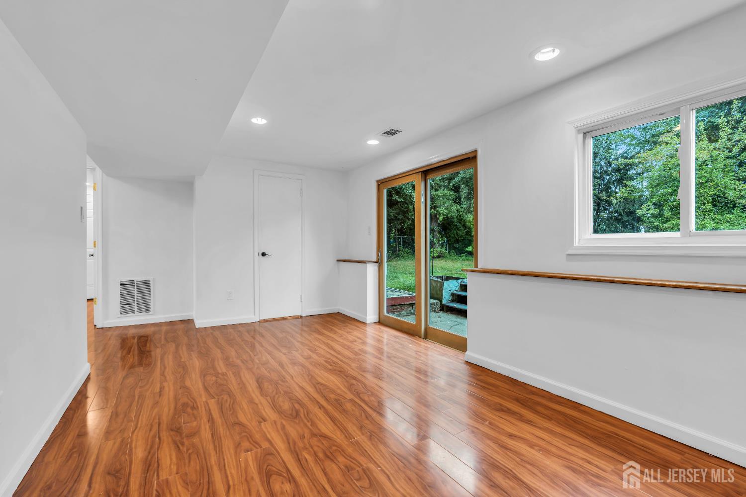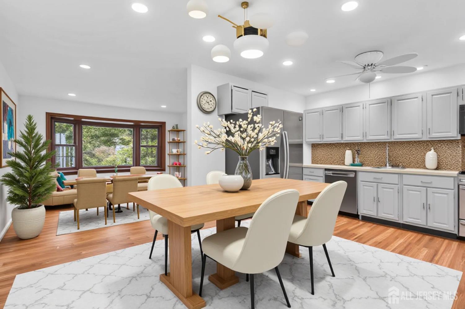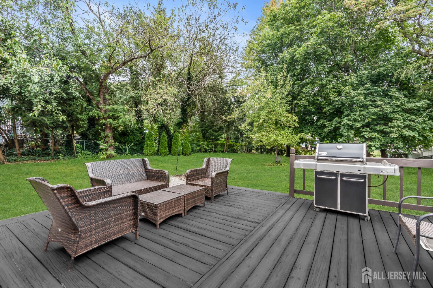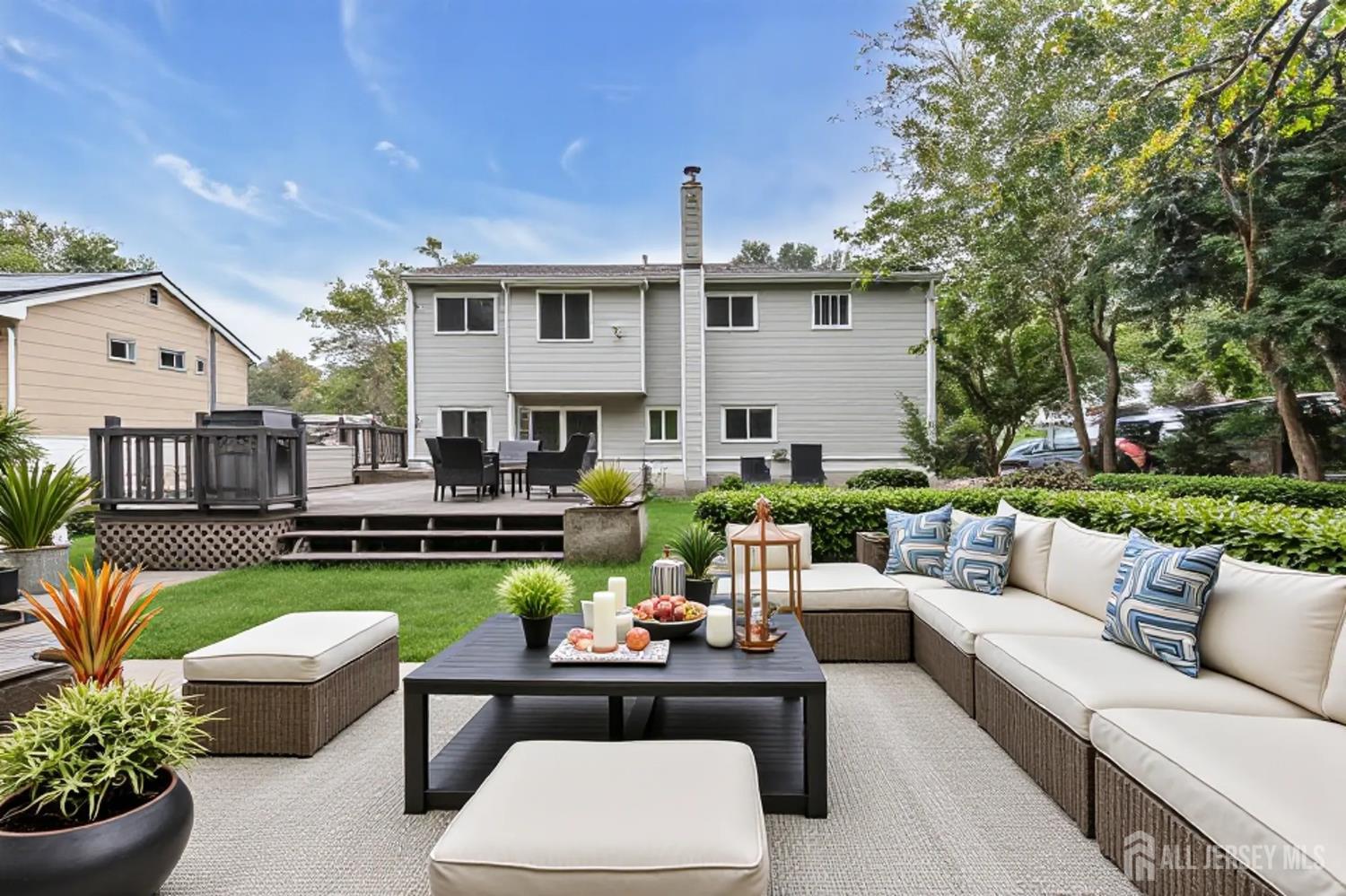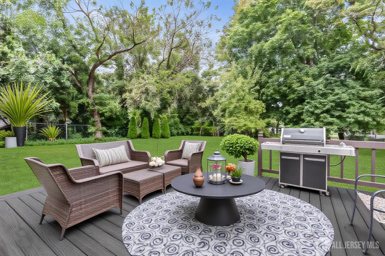 Welcome to this well-maintained 4-bedroom, 1.5-bath, 2-level home situated on a fenced, nearly one-third-acre lot, featuring a spacious deck ideal for entertaining or simply relaxing in your own private outdoor retreat. A dramatic 2-story entrance with a striking beveled-glass door and updated flooring sets the tone, opening to sun-filled spaces with hardwood floors. The interior has been freshly painted throughout, creating a bright, move-in-ready feel. Upstairs, the updated kitchen features stainless steel appliances, painted wood cabinets with new hardware, and new flooring. Thoughtfully open to the dining room, it flows seamlessly into the living room, which features a whole wall bay window, making it an ideal setup for gatherings. Three bedrooms and a refreshed full bath, featuring new flooring and a mirror, are complemented by 2-paneled doors with custom hardware, recessed lighting, fans, and pull-down attic stairs, making this level complete. The lower level is designed with flexibility in mind ideal for extended families or for enjoying entirely on your own. This level features an additional bedroom, a half bath, a spacious family room with French door sliders that open to the deck and great yard, a den, a laundry room, garage access, recessed lighting, and 6-panelled doors with custom hardware. With separate entrances and living areas, this home is ideal for extended family living. Added highlights include a 2022 new roof with all-new plywood and a 50-year warranty, a maintenance-free vinyl exterior, numerous recessed lights throughout, a spacious deck, and a beautiful property setting. Conveniently located near NY transportation, this home also enjoys East Brunswick's highly rated schools, shopping, fine dining, local theatre, nearby Princeton and Rutgers, and all the amenities that make East Brunswick such a desirable community. Virtually enhanced. CJMLS 2605093R