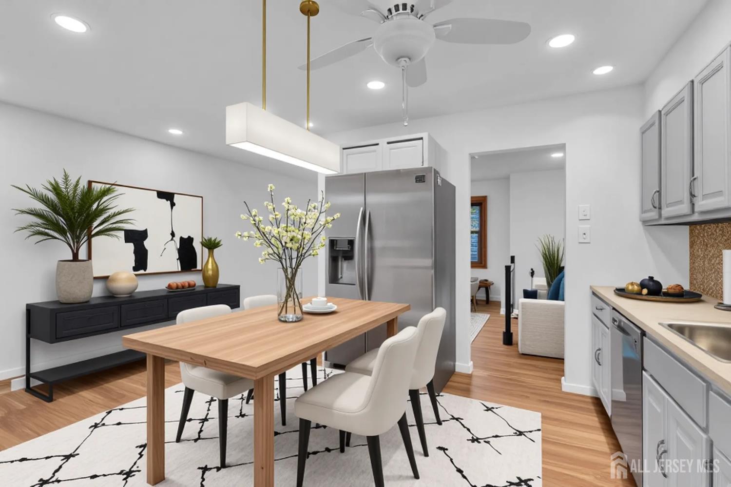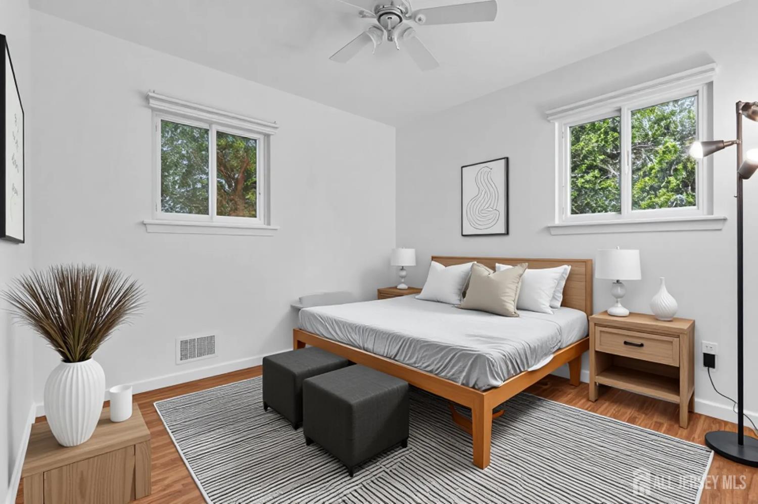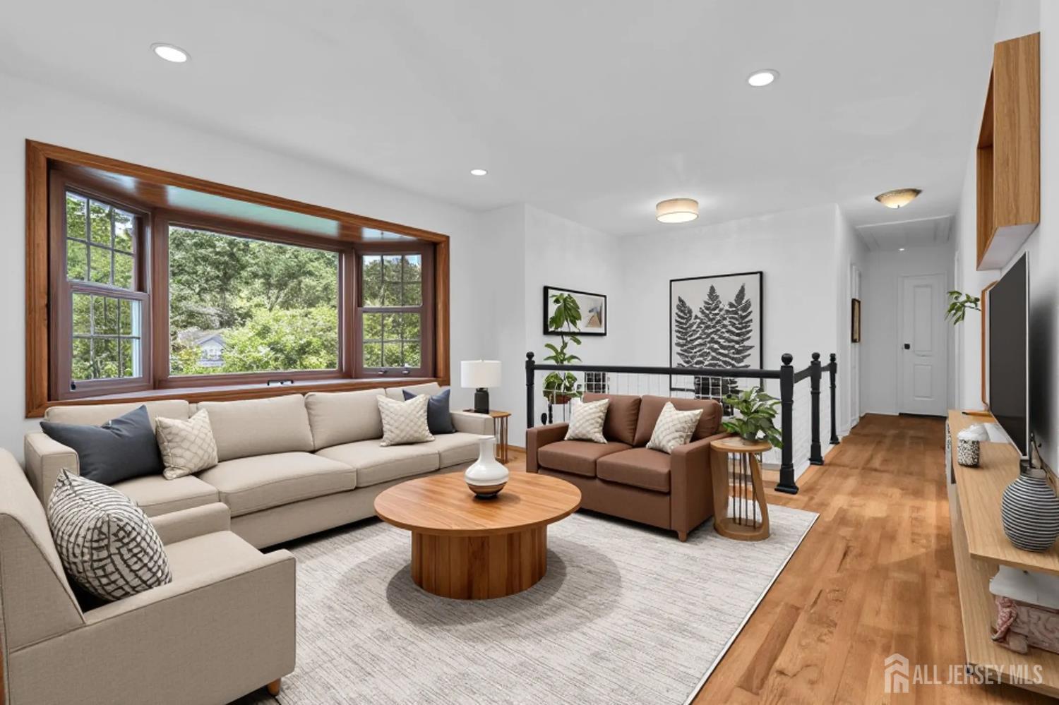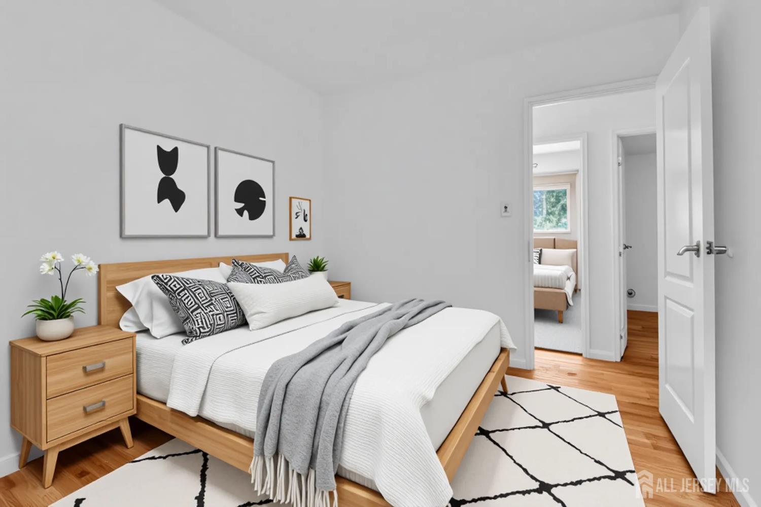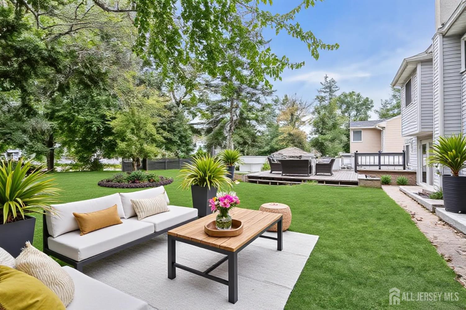 Welcome to this well-maintained 4-bedroom, 1.5-bath, 2-level home situated on a fenced, nearly one-third-acre lot, featuring a spacious deck ideal for entertaining or simply relaxing in your own private outdoor retreat. A dramatic 2-story entrance with a striking beveled-glass door and updated flooring sets the tone, opening to sun-filled spaces with hardwood floors. The interior has been freshly painted throughout, creating a bright, move-in-ready feel. Upstairs, the updated kitchen features stainless steel appliances, painted wood cabinets with new hardware, and new flooring. Thoughtfully open to the dining room, it flows seamlessly into the living room, which features a whole wall bay window, making it an ideal setup for gatherings. Three bedrooms and a refreshed full bath, featuring new flooring and a mirror, are complemented by 2-paneled doors with custom hardware, recessed lighting, fans, and pull-down attic stairs, making this level complete. The lower level is designed with flexibility in mind ideal for extended families or for enjoying entirely on your own. This level features an additional bedroom, a half bath, a spacious family room with French door sliders that open to the deck and great yard, a den, a laundry room, garage access, recessed lighting, and 6-panelled doors with custom hardware. With separate entrances and living areas, this home is ideal for extended family living. Added highlights include a 2022 new roof with all-new plywood and a 50-year warranty, a maintenance-free vinyl exterior, numerous recessed lights throughout, a spacious deck, and a beautiful property setting. Conveniently located near NY transportation, this home also enjoys East Brunswick's highly rated schools, shopping, fine dining, local theatre, nearby Princeton and Rutgers, and all the amenities that make East Brunswick such a desirable community. Virtually enhanced. CJMLS 2605093R