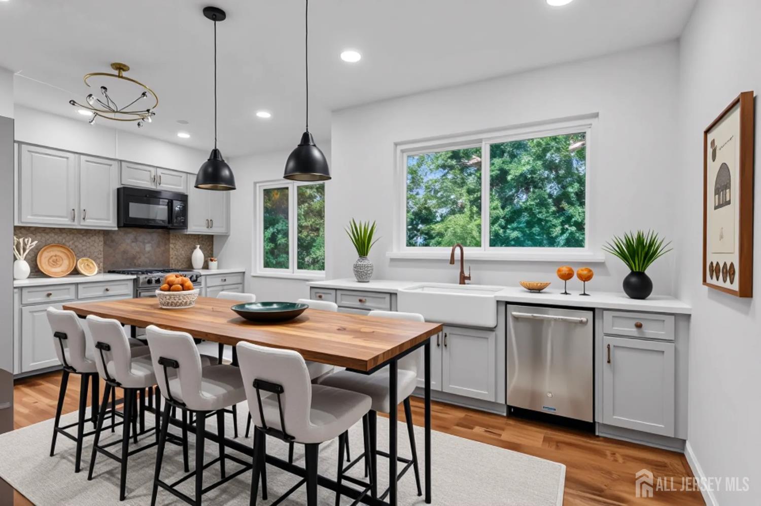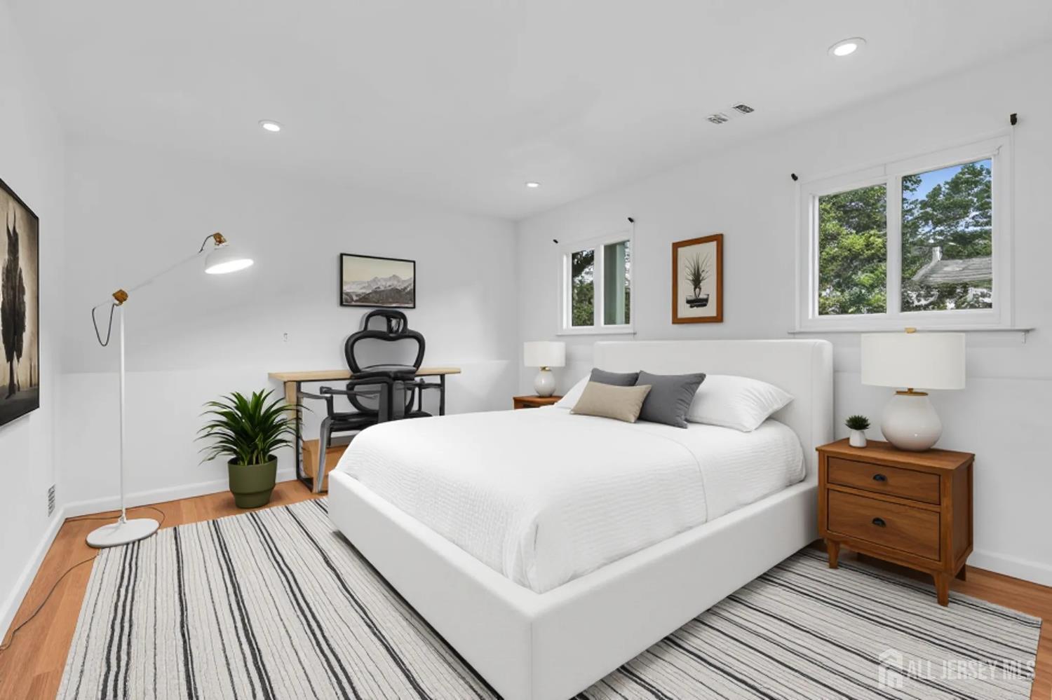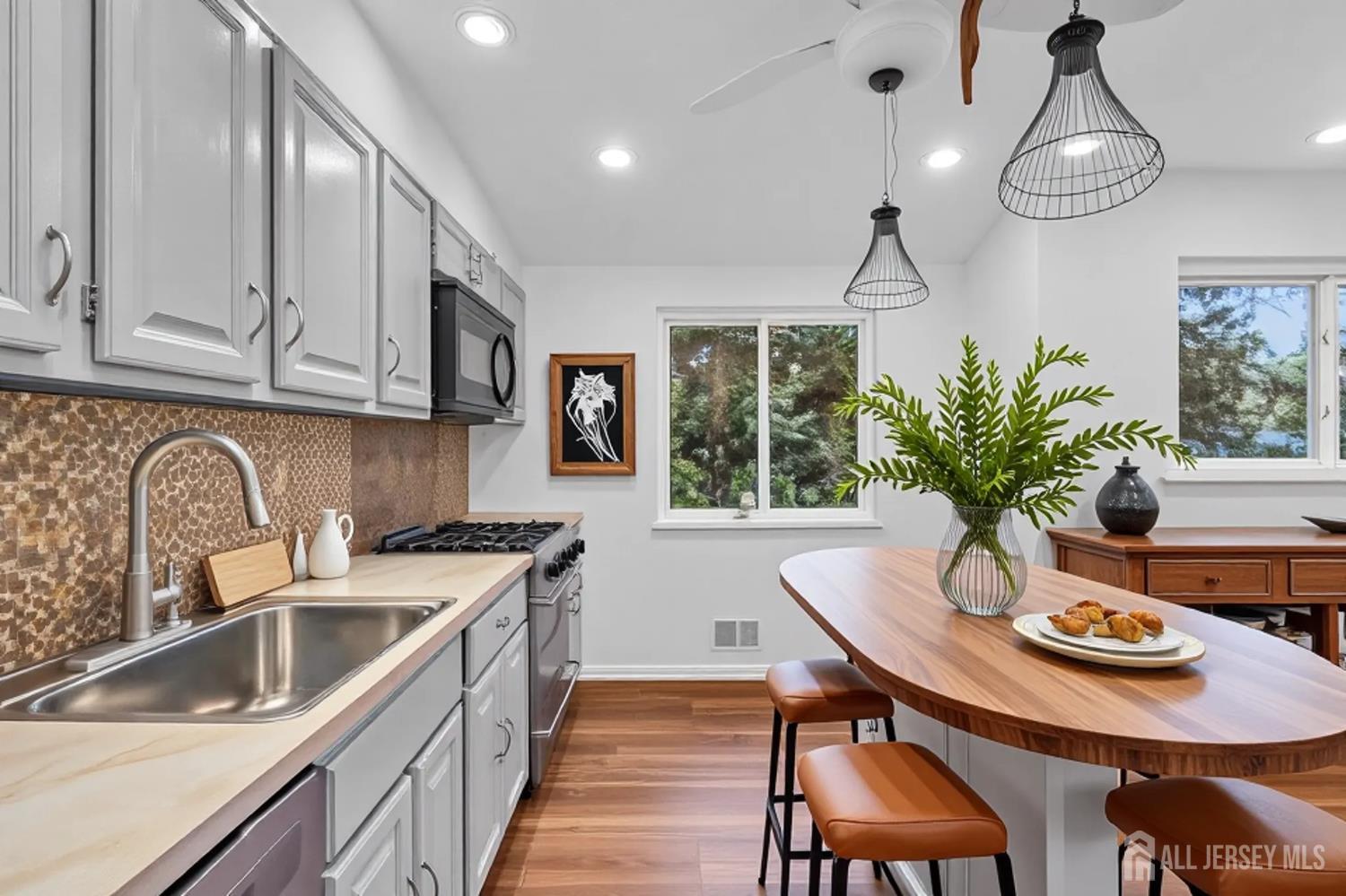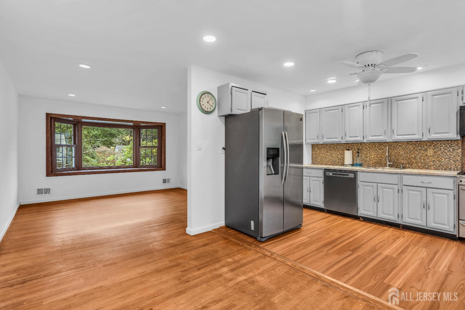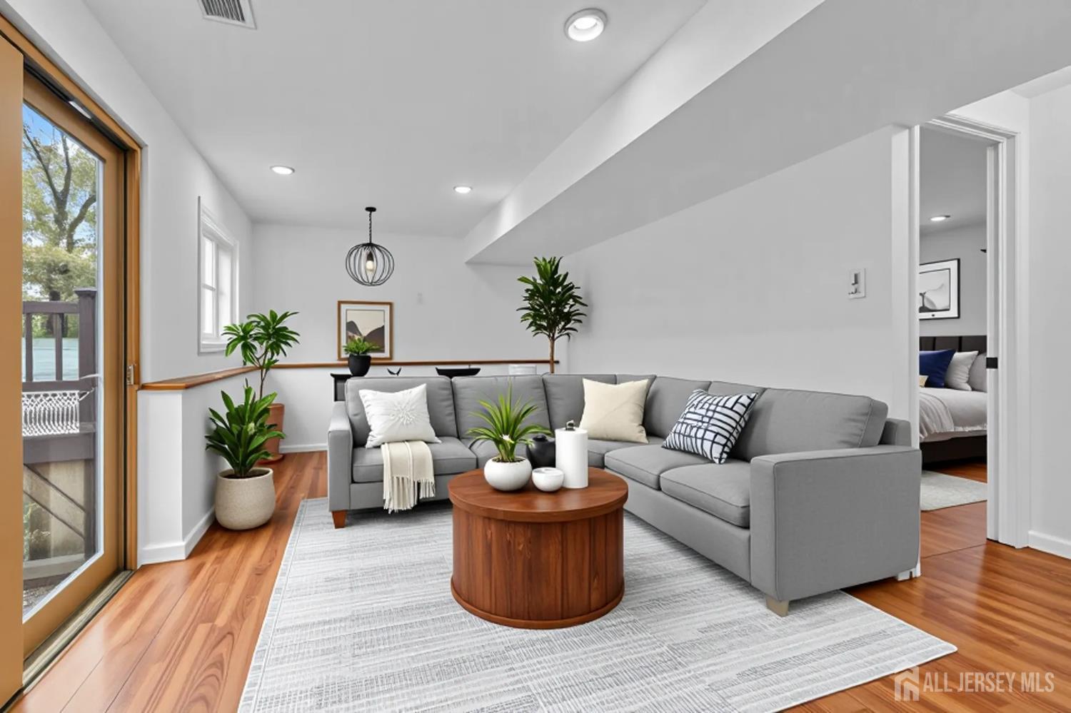 Welcome to this well-maintained 4-bedroom, 1.5-bath, 2-level home situated on a fenced, nearly one-third-acre lot, featuring a spacious deck ideal for entertaining or simply relaxing in your own private outdoor retreat. A dramatic 2-story entrance with a striking beveled-glass door and updated flooring sets the tone, opening to sun-filled spaces with hardwood floors. The interior has been freshly painted throughout, creating a bright, move-in-ready feel. Upstairs, the updated kitchen features stainless steel appliances, painted wood cabinets with new hardware, and new flooring. Thoughtfully open to the dining room, it flows seamlessly into the living room, which features a whole wall bay window, making it an ideal setup for gatherings. Three bedrooms and a refreshed full bath, featuring new flooring and a mirror, are complemented by 2-paneled doors with custom hardware, recessed lighting, fans, and pull-down attic stairs, making this level complete. The lower level is designed with flexibility in mind ideal for extended families or for enjoying entirely on your own. This level features an additional bedroom, a half bath, a spacious family room with French door sliders that open to the deck and great yard, a den, a laundry room, garage access, recessed lighting, and 6-panelled doors with custom hardware. With separate entrances and living areas, this home is ideal for extended family living. Added highlights include a 2022 new roof with all-new plywood and a 50-year warranty, a maintenance-free vinyl exterior, numerous recessed lights throughout, a spacious deck, and a beautiful property setting. Conveniently located near NY transportation, this home also enjoys East Brunswick's highly rated schools, shopping, fine dining, local theatre, nearby Princeton and Rutgers, and all the amenities that make East Brunswick such a desirable community. Virtually enhanced. CJMLS 2605093R