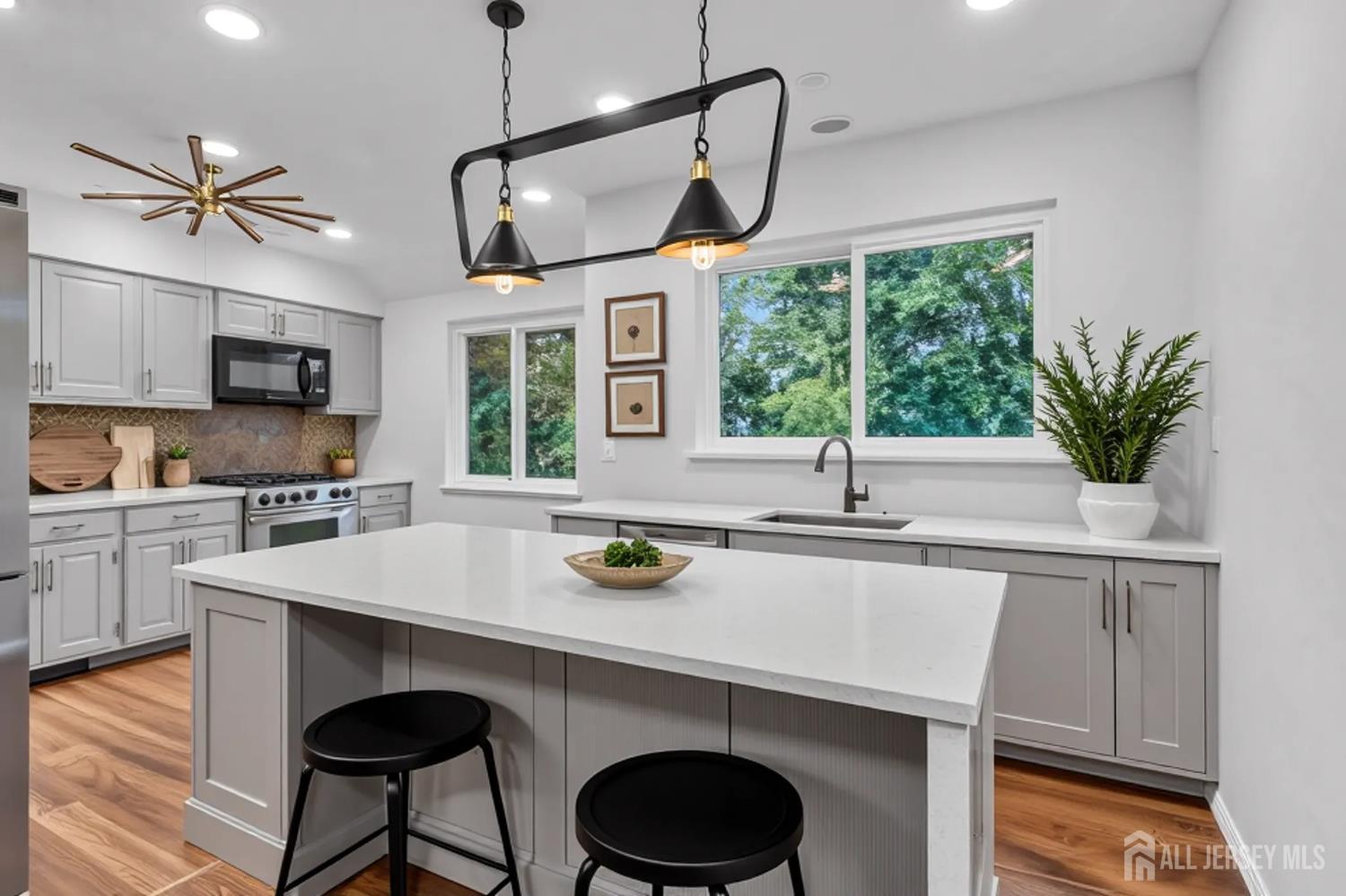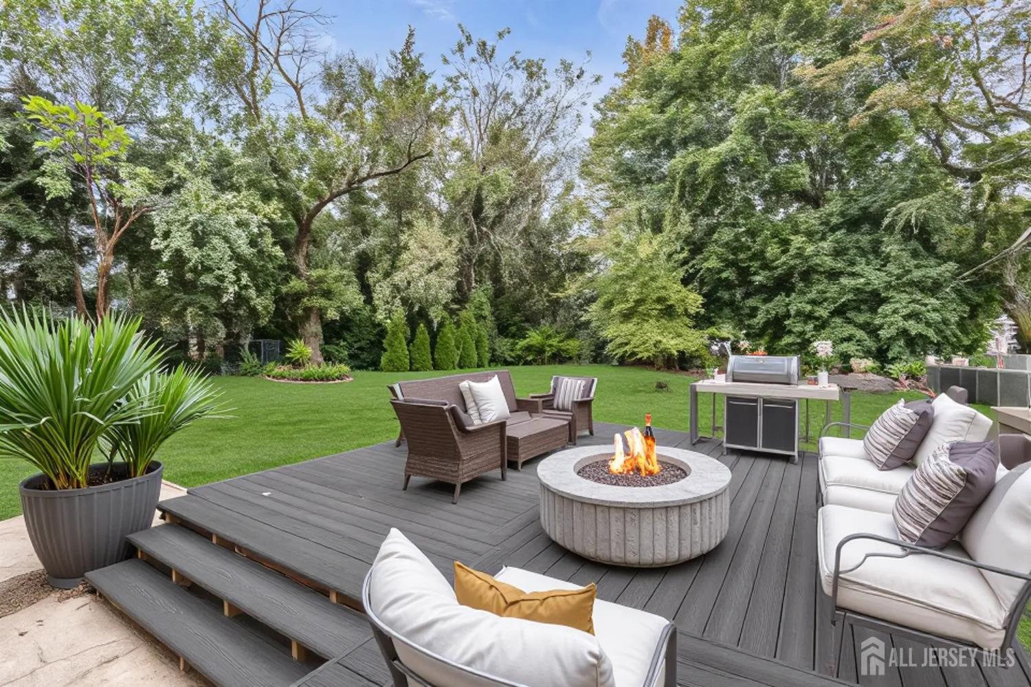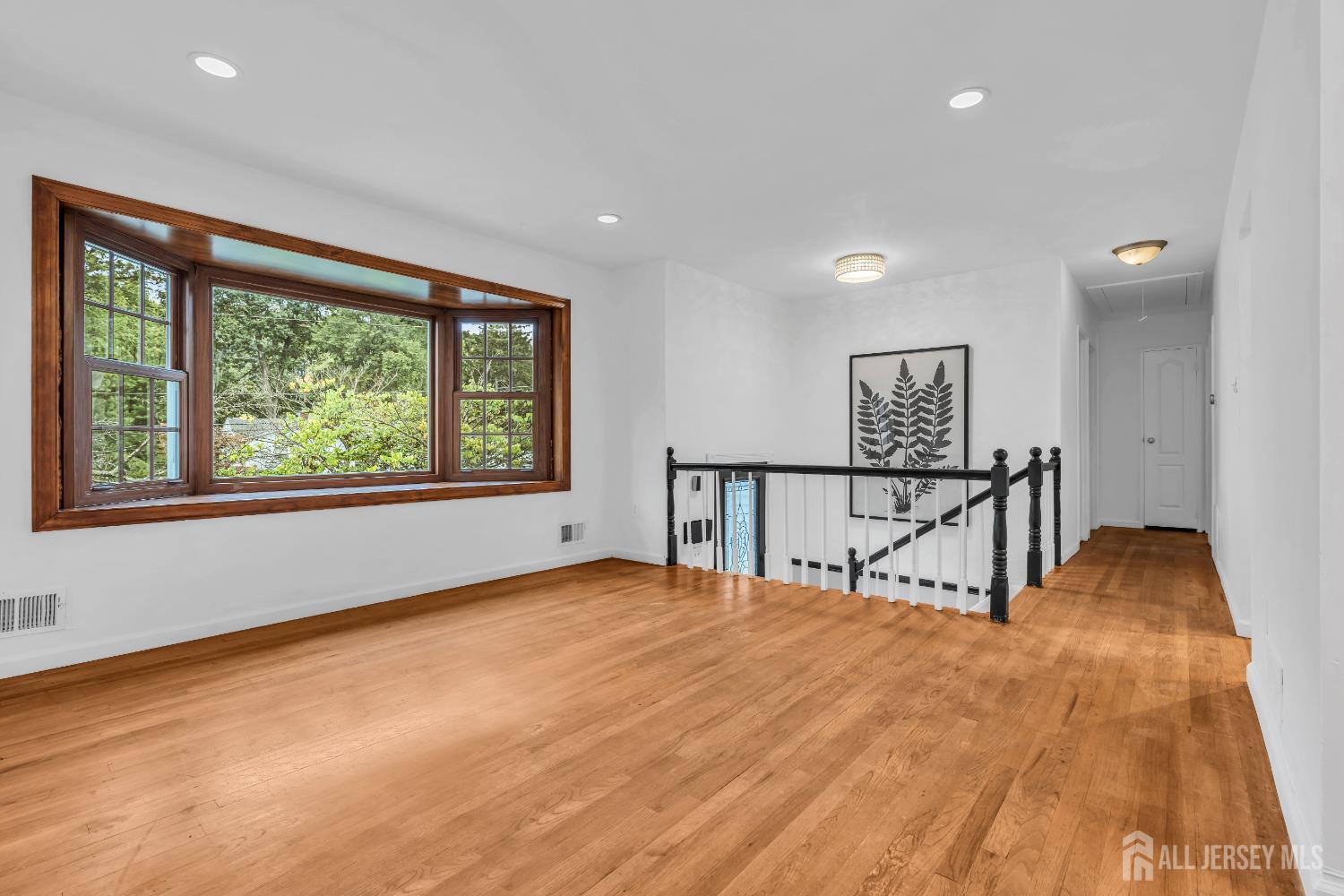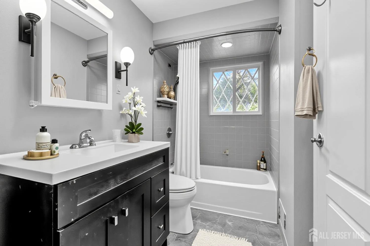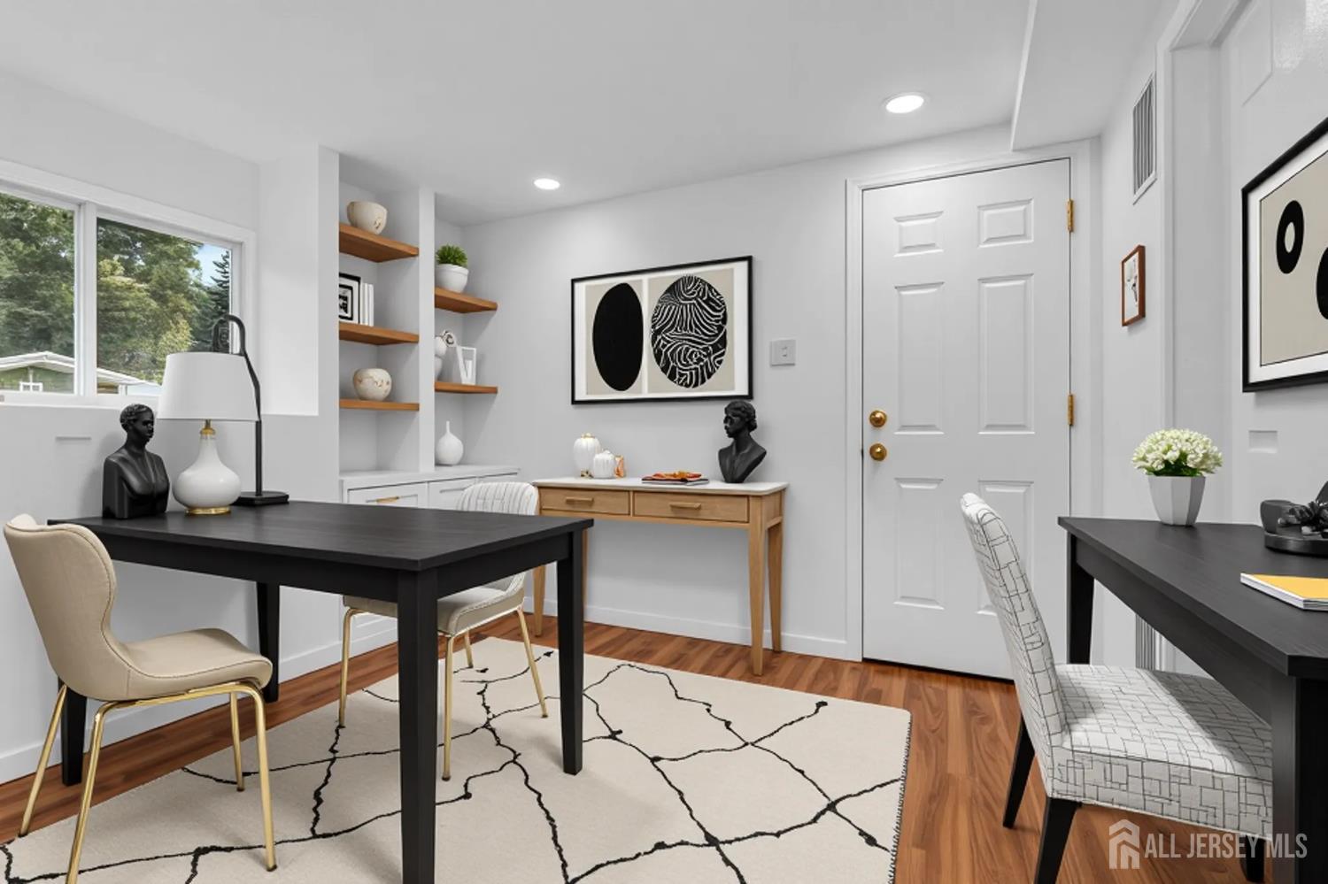 Welcome to this well-maintained 4-bedroom, 1.5-bath, 2-level home situated on a fenced, nearly one-third-acre lot, featuring a spacious deck ideal for entertaining or simply relaxing in your own private outdoor retreat. A dramatic 2-story entrance with a striking beveled-glass door and updated flooring sets the tone, opening to sun-filled spaces with hardwood floors. The interior has been freshly painted throughout, creating a bright, move-in-ready feel. Upstairs, the updated kitchen features stainless steel appliances, painted wood cabinets with new hardware, and new flooring. Thoughtfully open to the dining room, it flows seamlessly into the living room, which features a whole wall bay window, making it an ideal setup for gatherings. Three bedrooms and a refreshed full bath, featuring new flooring and a mirror, are complemented by 2-paneled doors with custom hardware, recessed lighting, fans, and pull-down attic stairs, making this level complete. The lower level is designed with flexibility in mind ideal for extended families or for enjoying entirely on your own. This level features an additional bedroom, a half bath, a spacious family room with French door sliders that open to the deck and great yard, a den, a laundry room, garage access, recessed lighting, and 6-panelled doors with custom hardware. With separate entrances and living areas, this home is ideal for extended family living. Added highlights include a 2022 new roof with all-new plywood and a 50-year warranty, a maintenance-free vinyl exterior, numerous recessed lights throughout, a spacious deck, and a beautiful property setting. Conveniently located near NY transportation, this home also enjoys East Brunswick's highly rated schools, shopping, fine dining, local theatre, nearby Princeton and Rutgers, and all the amenities that make East Brunswick such a desirable community. Virtually enhanced. CJMLS 2605093R