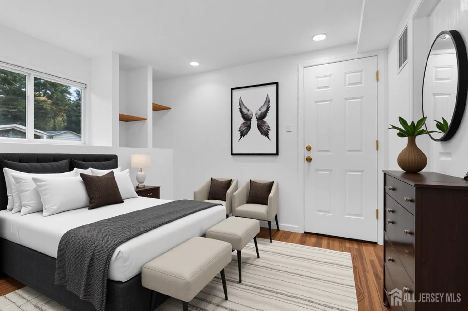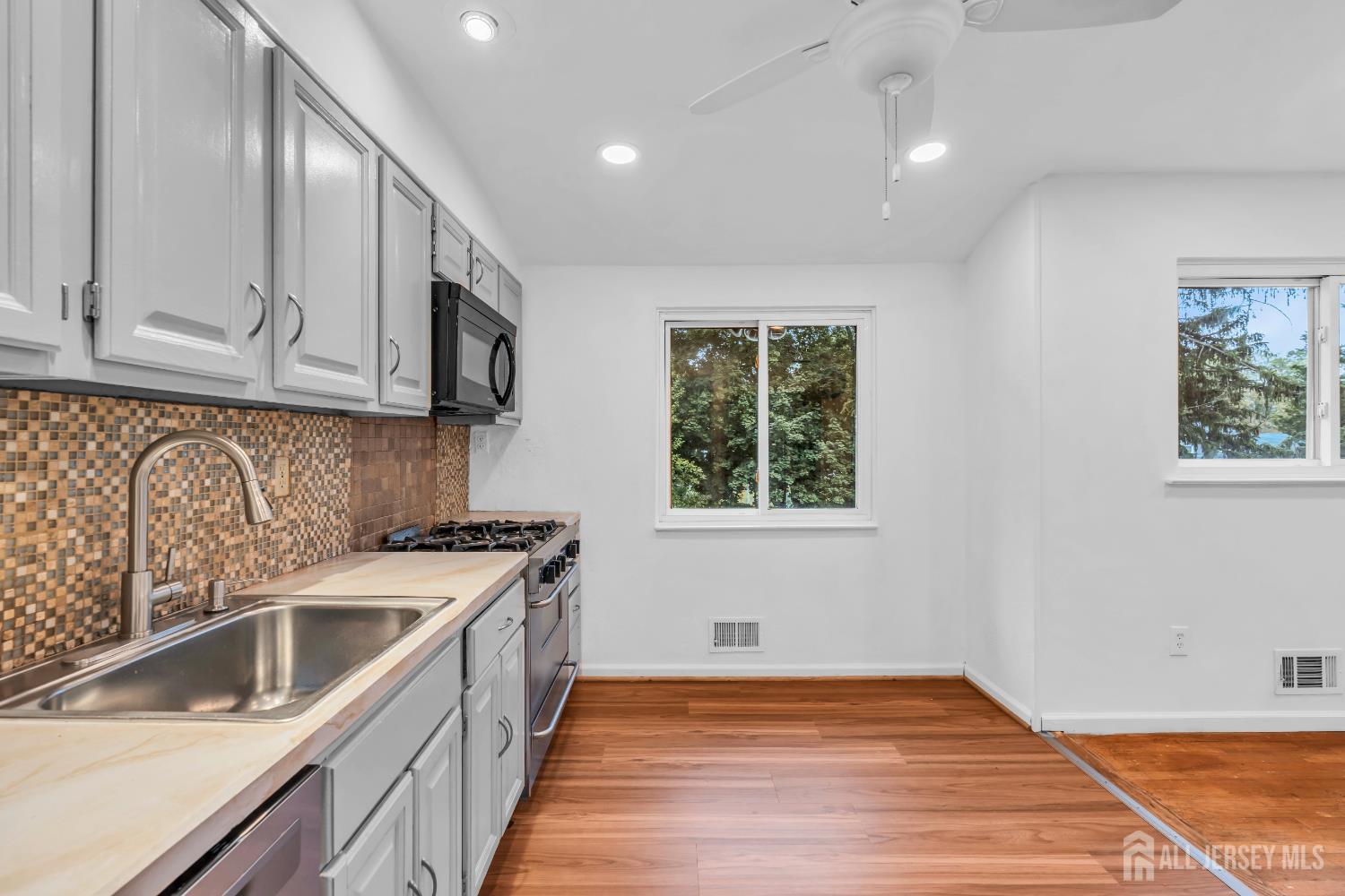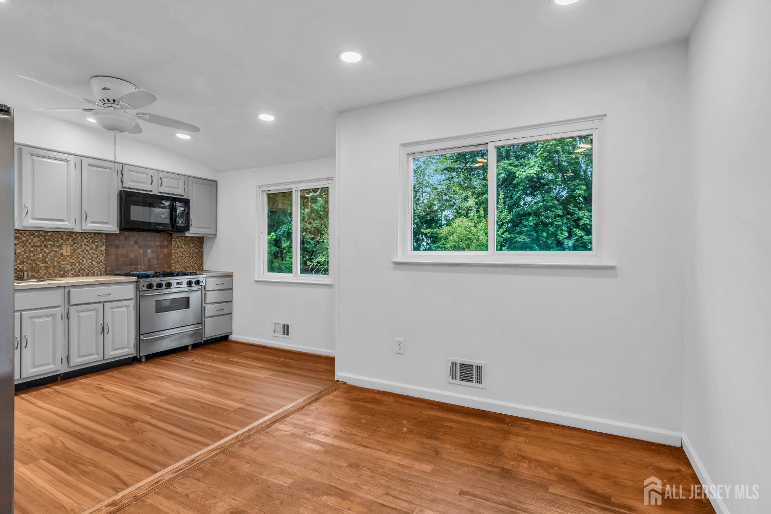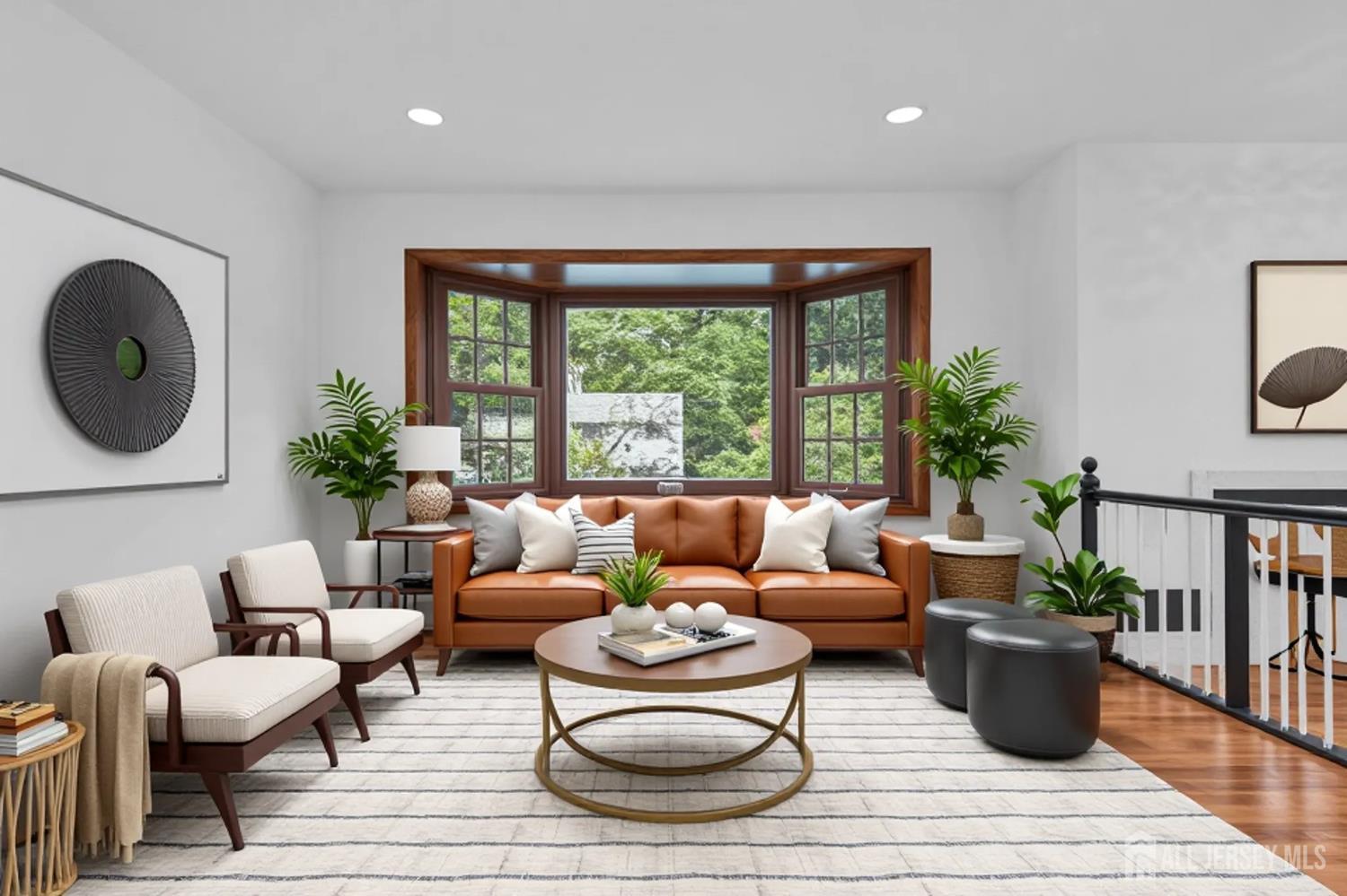 Welcome to this well-maintained 4-bedroom, 1.5-bath, 2-level home situated on a fenced, nearly one-third-acre lot, featuring a spacious deck ideal for entertaining or simply relaxing in your own private outdoor retreat. A dramatic 2-story entrance with a striking beveled-glass door and updated flooring sets the tone, opening to sun-filled spaces with hardwood floors. The interior has been freshly painted throughout, creating a bright, move-in-ready feel. Upstairs, the updated kitchen features stainless steel appliances, painted wood cabinets with new hardware, and new flooring. Thoughtfully open to the dining room, it flows seamlessly into the living room, which features a whole wall bay window, making it an ideal setup for gatherings. Three bedrooms and a refreshed full bath, featuring new flooring and a mirror, are complemented by 2-paneled doors with custom hardware, recessed lighting, fans, and pull-down attic stairs, making this level complete. The lower level is designed with flexibility in mind ideal for extended families or for enjoying entirely on your own. This level features an additional bedroom, a half bath, a spacious family room with French door sliders that open to the deck and great yard, a den, a laundry room, garage access, recessed lighting, and 6-panelled doors with custom hardware. With separate entrances and living areas, this home is ideal for extended family living. Added highlights include a 2022 new roof with all-new plywood and a 50-year warranty, a maintenance-free vinyl exterior, numerous recessed lights throughout, a spacious deck, and a beautiful property setting. Conveniently located near NY transportation, this home also enjoys East Brunswick's highly rated schools, shopping, fine dining, local theatre, nearby Princeton and Rutgers, and all the amenities that make East Brunswick such a desirable community. Virtually enhanced. CJMLS 2605093R