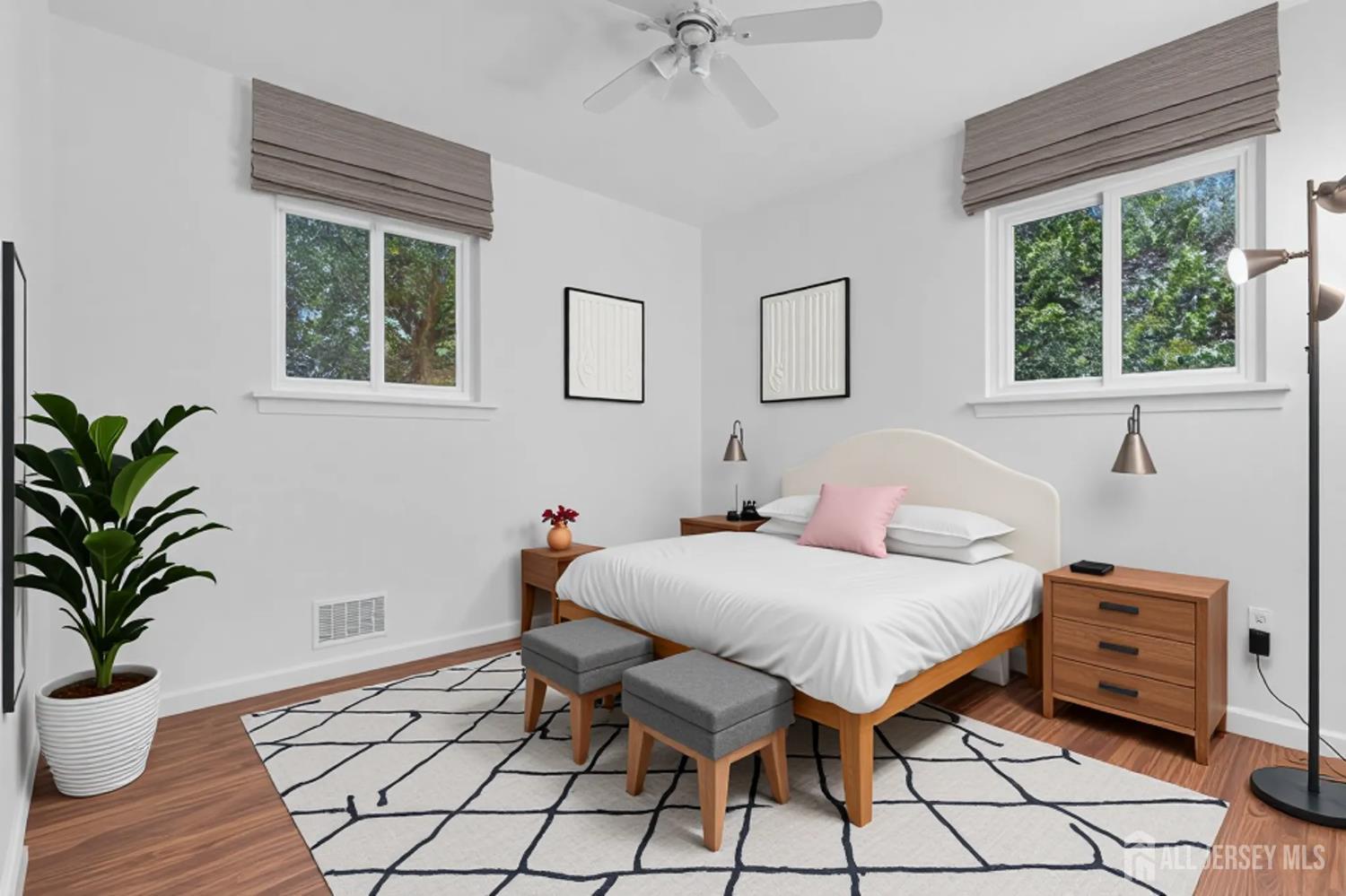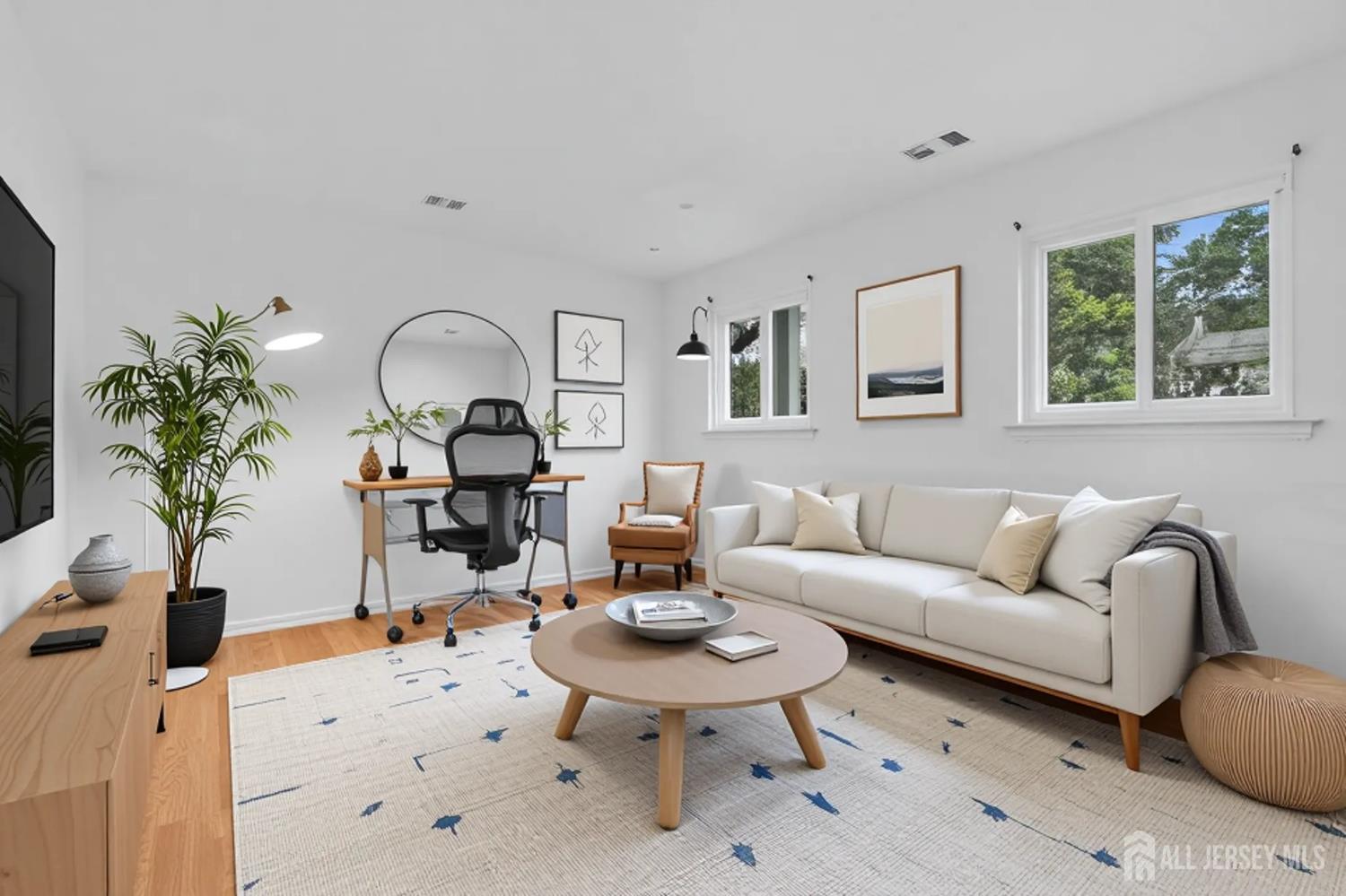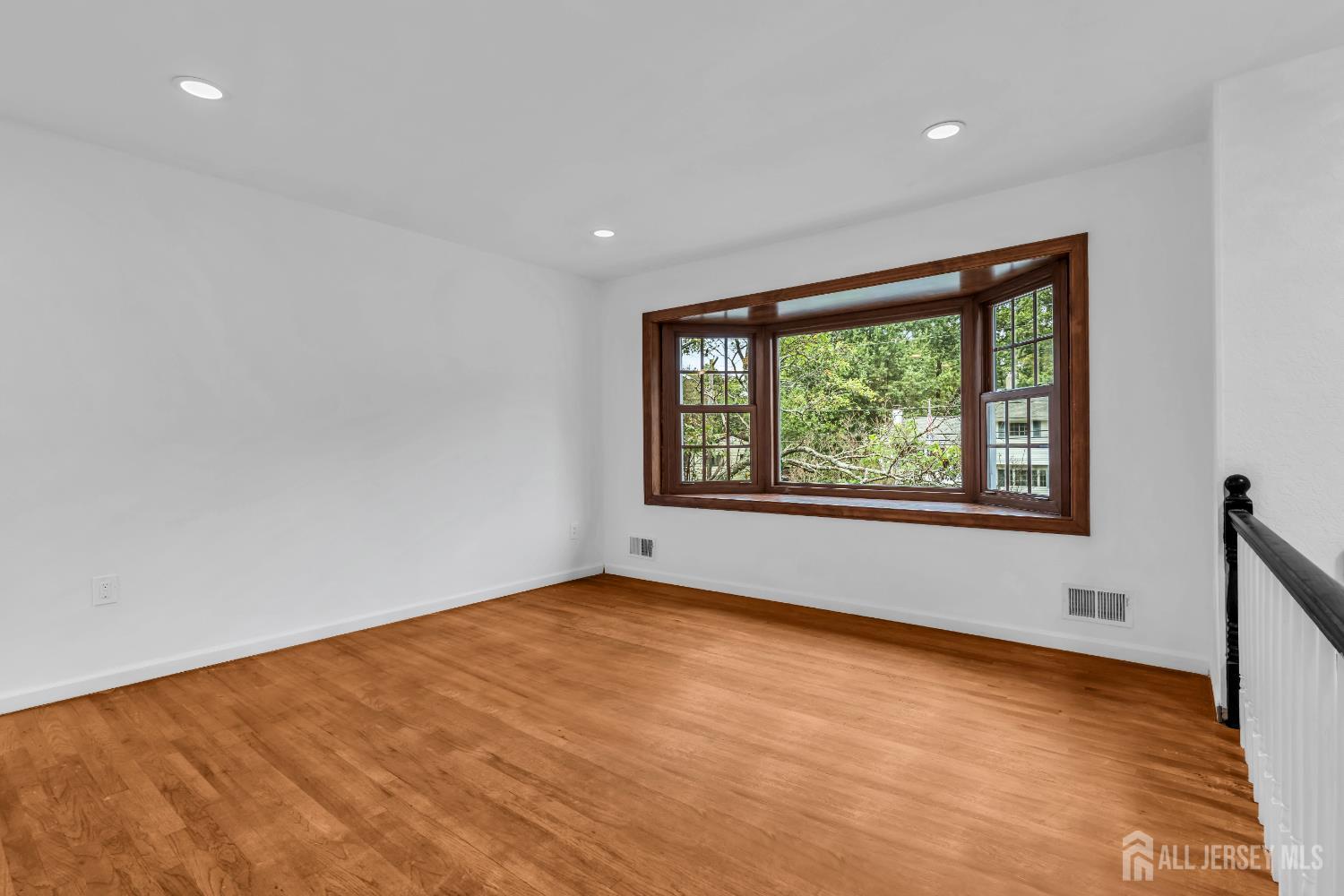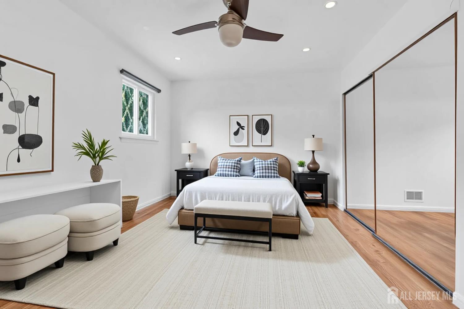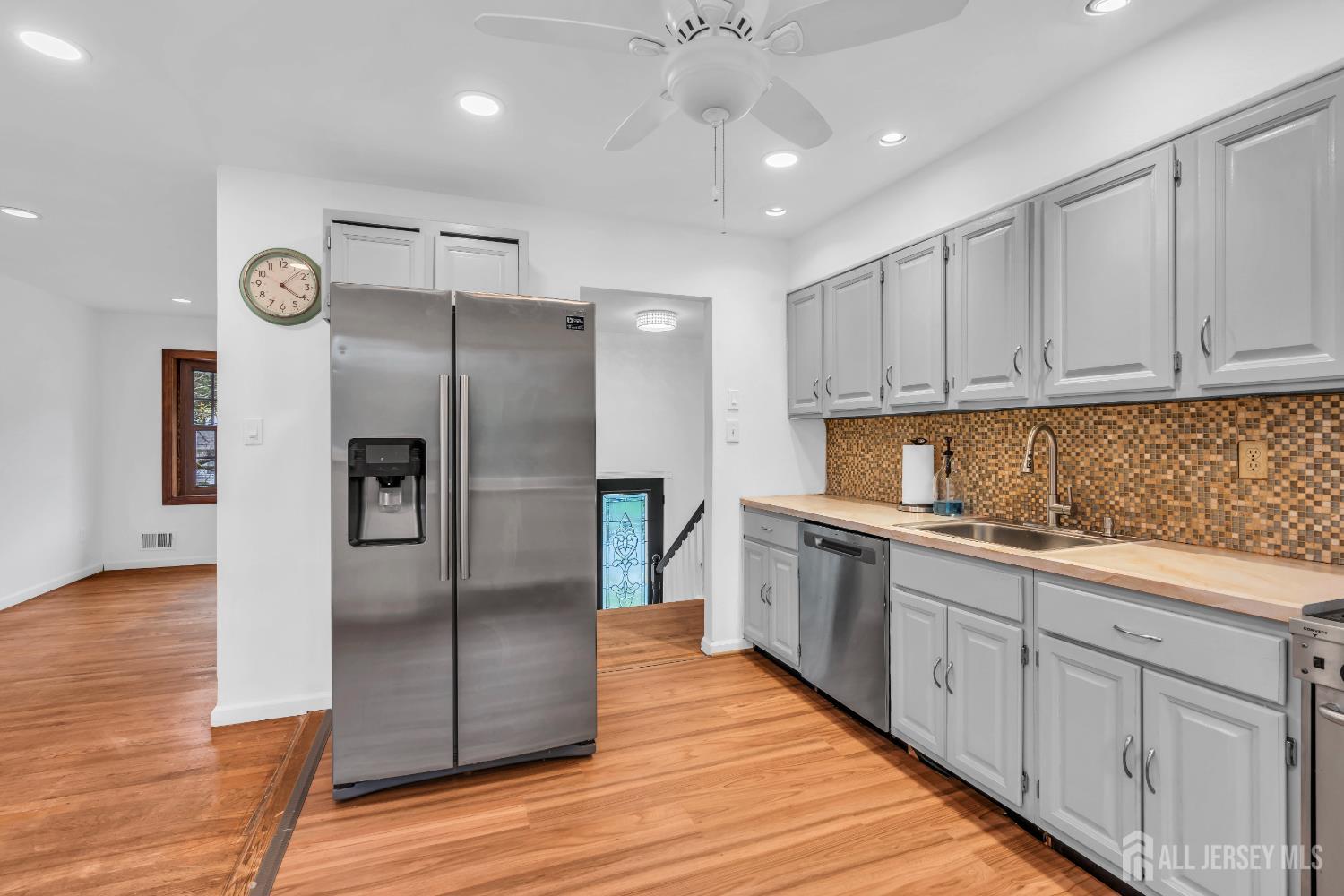 Welcome to this well-maintained 4-bedroom, 1.5-bath, 2-level home situated on a fenced, nearly one-third-acre lot, featuring a spacious deck ideal for entertaining or simply relaxing in your own private outdoor retreat. A dramatic 2-story entrance with a striking beveled-glass door and updated flooring sets the tone, opening to sun-filled spaces with hardwood floors. The interior has been freshly painted throughout, creating a bright, move-in-ready feel. Upstairs, the updated kitchen features stainless steel appliances, painted wood cabinets with new hardware, and new flooring. Thoughtfully open to the dining room, it flows seamlessly into the living room, which features a whole wall bay window, making it an ideal setup for gatherings. Three bedrooms and a refreshed full bath, featuring new flooring and a mirror, are complemented by 2-paneled doors with custom hardware, recessed lighting, fans, and pull-down attic stairs, making this level complete. The lower level is designed with flexibility in mind ideal for extended families or for enjoying entirely on your own. This level features an additional bedroom, a half bath, a spacious family room with French door sliders that open to the deck and great yard, a den, a laundry room, garage access, recessed lighting, and 6-panelled doors with custom hardware. With separate entrances and living areas, this home is ideal for extended family living. Added highlights include a 2022 new roof with all-new plywood and a 50-year warranty, a maintenance-free vinyl exterior, numerous recessed lights throughout, a spacious deck, and a beautiful property setting. Conveniently located near NY transportation, this home also enjoys East Brunswick's highly rated schools, shopping, fine dining, local theatre, nearby Princeton and Rutgers, and all the amenities that make East Brunswick such a desirable community. Virtually enhanced. CJMLS 2605093R