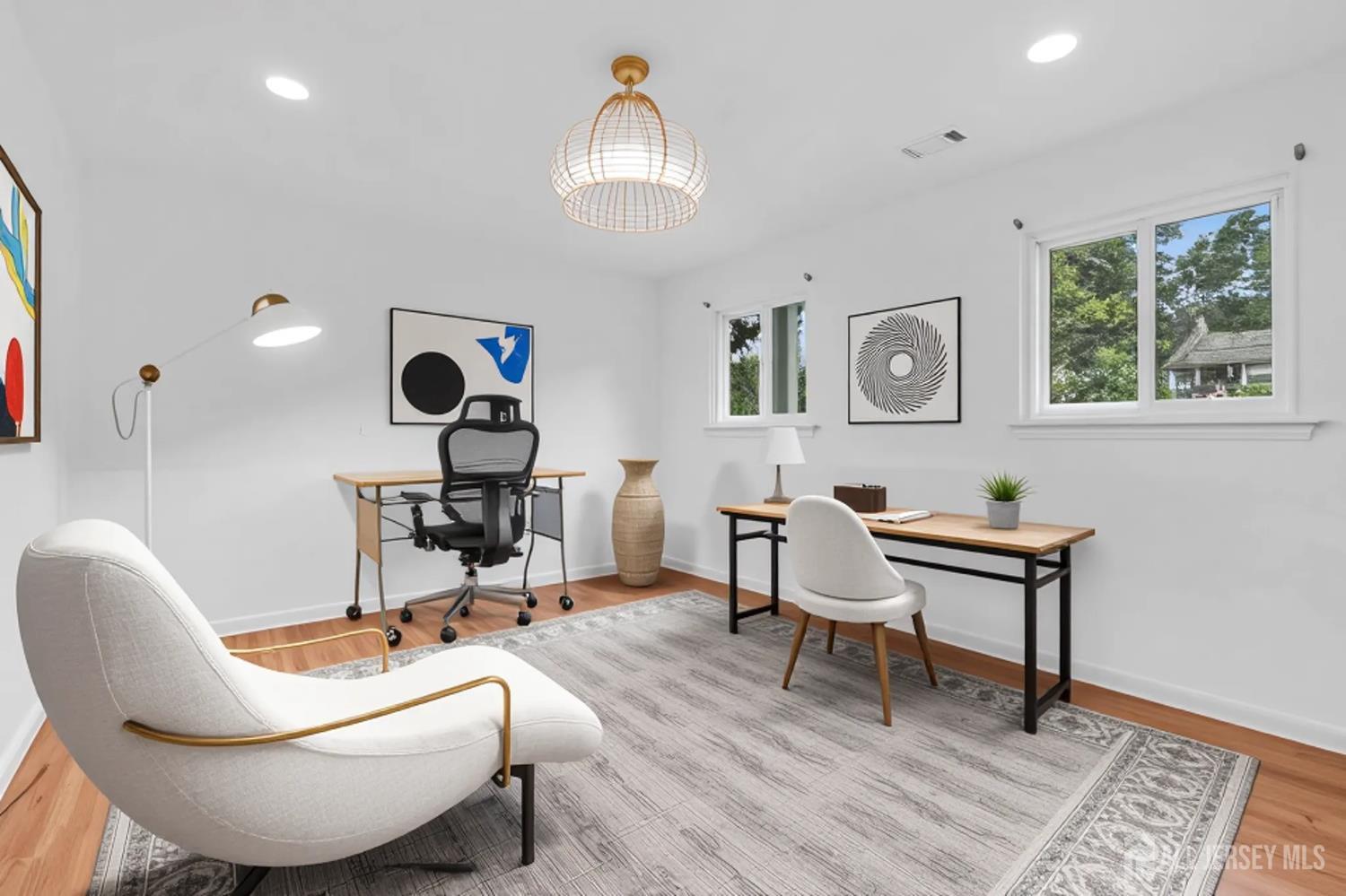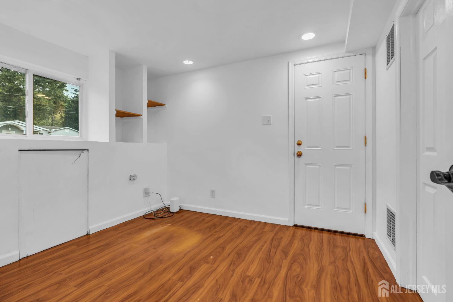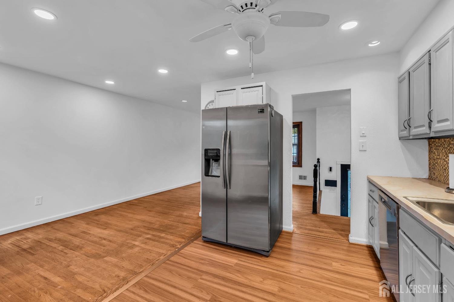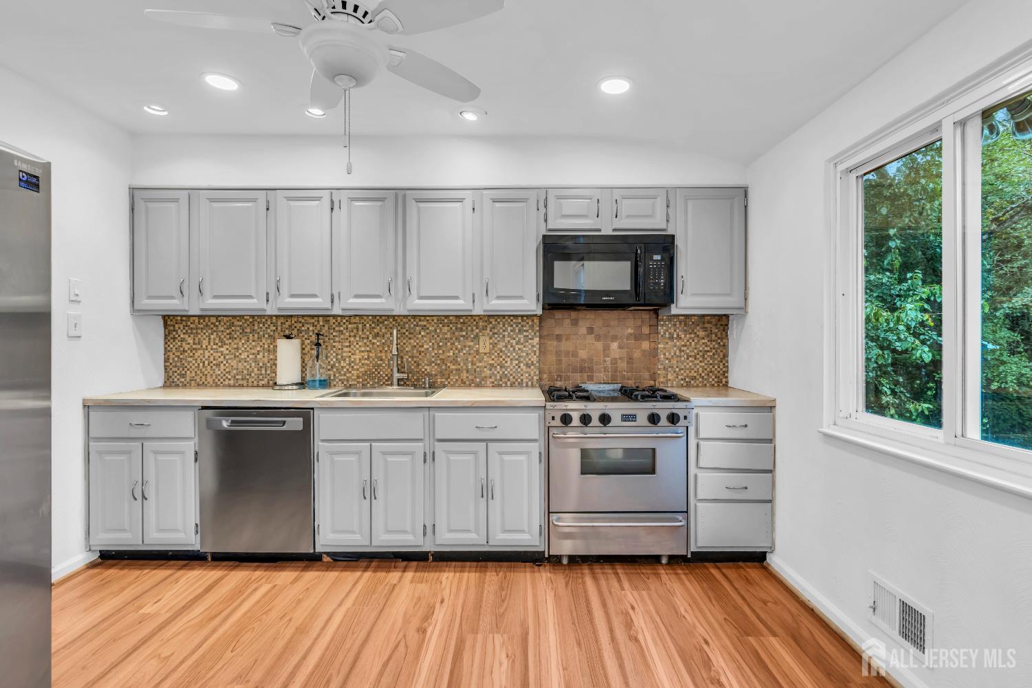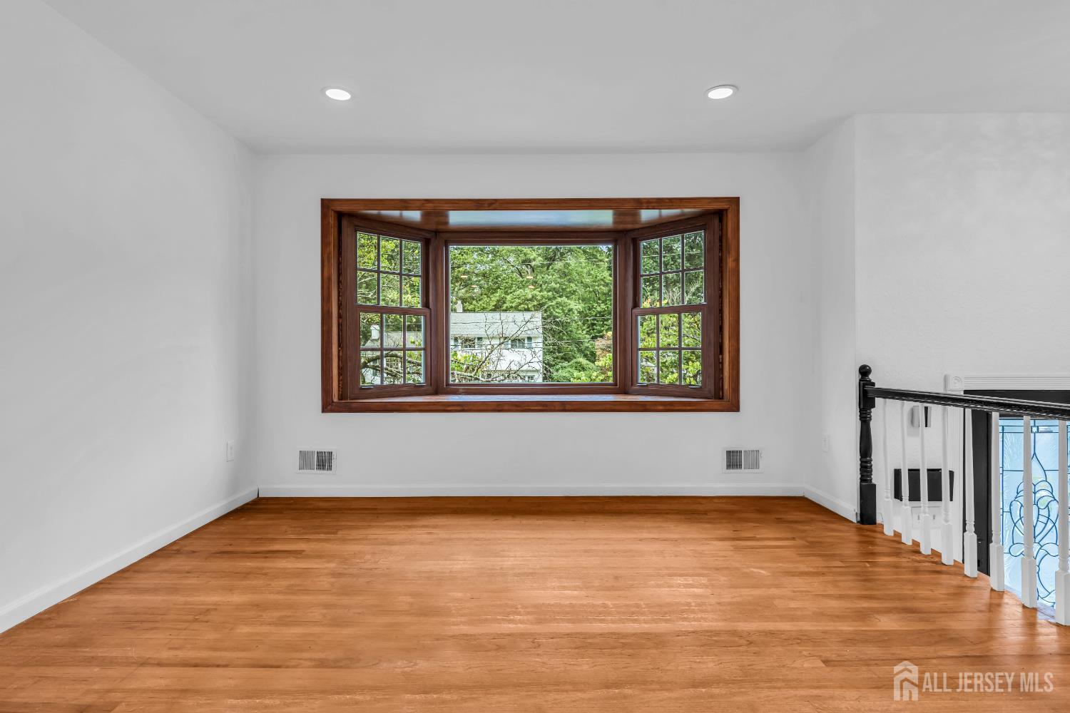Welcome to this well-maintained 4-bedroom, 1.5-bath, 2-level home situated on a fenced, nearly one-third-acre lot, featuring a spacious deck ideal for entertaining or simply relaxing in your own private outdoor retreat. A dramatic 2-story entrance with a striking beveled-glass door and updated flooring sets the tone, opening to sun-filled spaces with hardwood floors. The interior has been freshly painted throughout, creating a bright, move-in-ready feel. Upstairs, the updated kitchen features stainless steel appliances, painted wood cabinets with new hardware, and new flooring. Thoughtfully open to the dining room, it flows seamlessly into the living room, which features a whole wall bay window, making it an ideal setup for gatherings. Three bedrooms and a refreshed full bath, featuring new flooring and a mirror, are complemented by 2-paneled doors with custom hardware, recessed lighting, fans, and pull-down attic stairs, making this level complete. The lower level is designed with flexibility in mind ideal for extended families or for enjoying entirely on your own. This level features an additional bedroom, a half bath, a spacious family room with French door sliders that open to the deck and great yard, a den, a laundry room, garage access, recessed lighting, and 6-panelled doors with custom hardware. With separate entrances and living areas, this home is ideal for extended family living. Added highlights include a 2022 new roof with all-new plywood and a 50-year warranty, a maintenance-free vinyl exterior, numerous recessed lights throughout, a spacious deck, and a beautiful property setting. Conveniently located near NY transportation, this home also enjoys East Brunswick's highly rated schools, shopping, fine dining, local theatre, nearby Princeton and Rutgers, and all the amenities that make East Brunswick such a desirable community. Virtually enhanced. CJMLS 2605093R