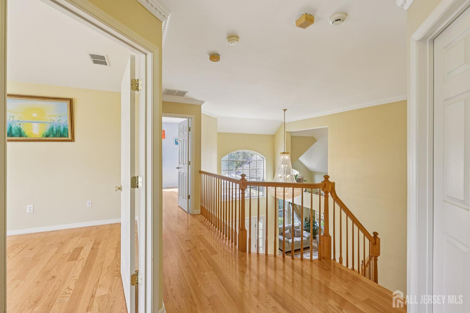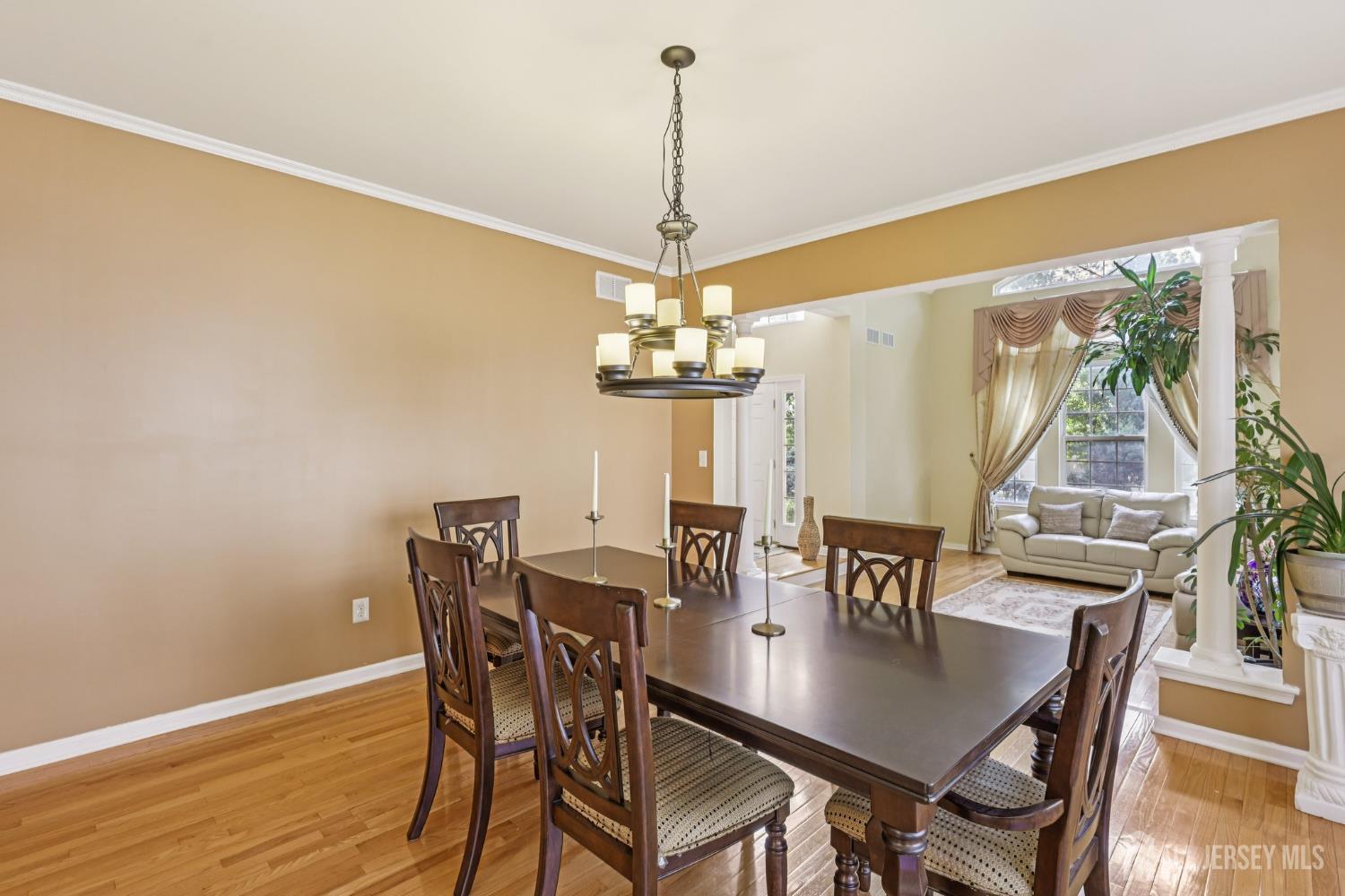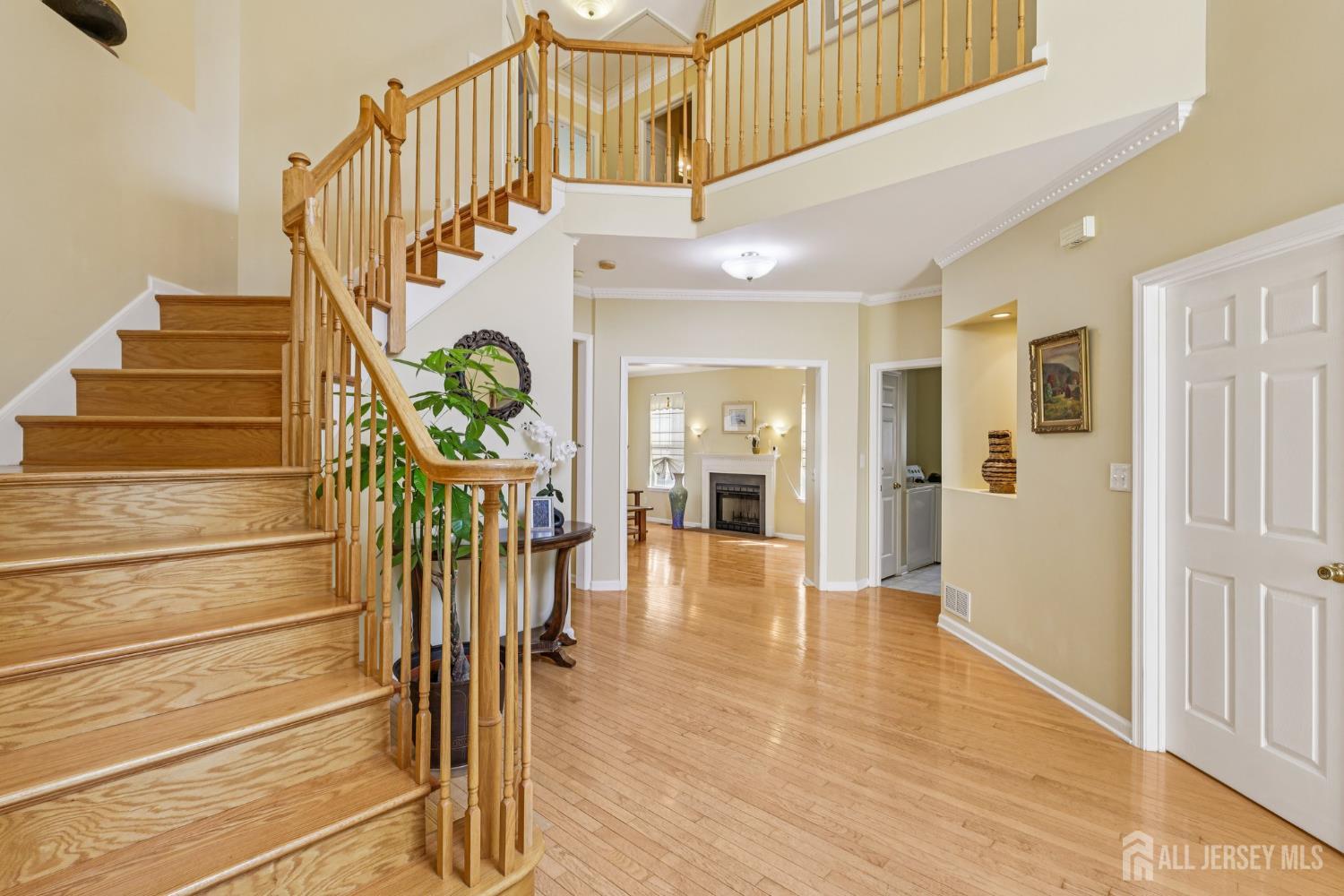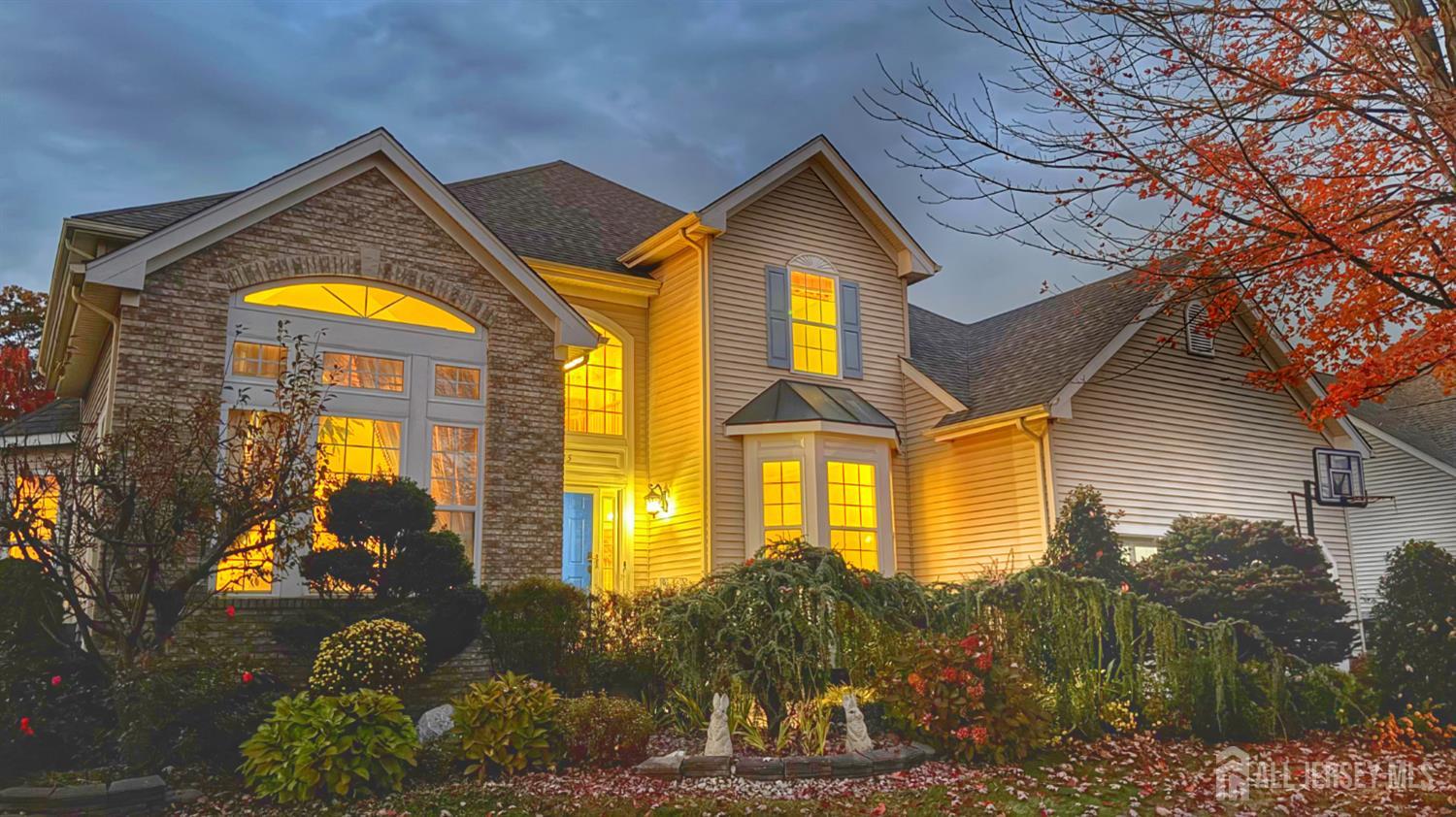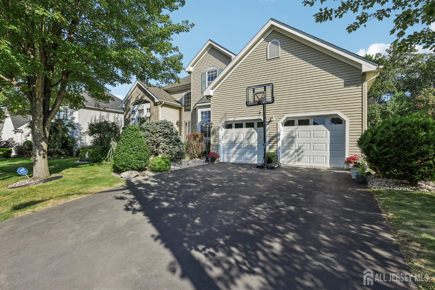 In the prestigious Apple Ridge Estates, discover an exceptional East Brunswick colonial boasting nearly 3,300 square feet of luxury living on a premium lot backing to tranquil conservation land. This estate features four spacious bedrooms upstairs along with a fifth bedroom option or office on the main level, complete with a full bath, ideal for multi-generational living or guest accommodations. The grand two-story foyer, illuminated by an elegant chandelier, opens to a spectacular great room with cathedral ceilings that overlook the formal dining area. Beautiful custom wall niches with accent lighting, crown molding, and hardwood flooring throughout showcase the home's craftsmanship and attention to detail. The gourmet kitchen is appointed with granite countertops, 42-inch cabinets, and sliders that open to a park-like backyard featuring a deck and gazebo perfect for outdoor entertaining or quiet evenings surrounded by nature. Recent upgrades add tremendous value, including a brand-new HVAC system,furnace, and tankless hot water heater (2024), a new hardwood staircase(2024),new garage doors, and a 10-year-young roof. Additional features include a smart sprinkler system controller, an electric vehicle charging station with a Level 2 charger, and professionally designed landscaping that enhances the property's curb appeal. Upstairs, the expansive primary suite impresses with double walk-in closets and a sun-filled ensuite bath with a skylight. The full basement with upgraded high ceilings offers endless possibilities for future customization. Commuters will love the home's prime location with easy access to express buses to New York City and Jersey City, Route 18, Route 1, and the NJ Turnpike, this home is also close to Downtown New Brunswick, Rutgers University, major hospitals, shopping, and dining. Zoned for acclaimed East Brunswick Blue Ribbon School District. This luxurious home combines size, style, and location, offering unmatched value in one of East Brunswick's most desirable neighborhoods that will not last! CJMLS 2607015R