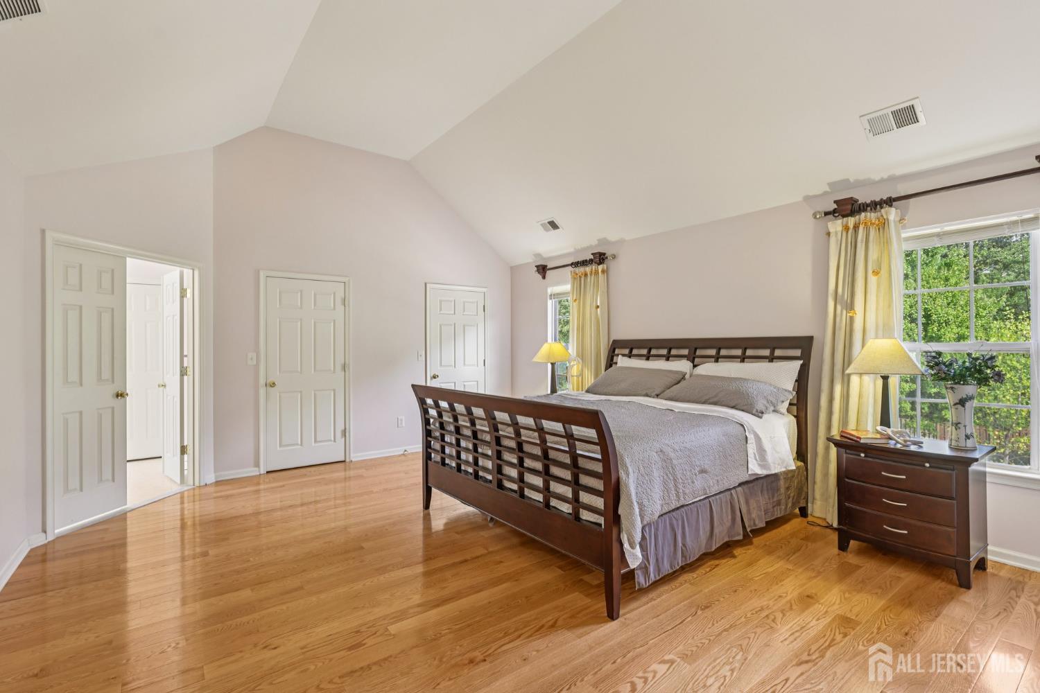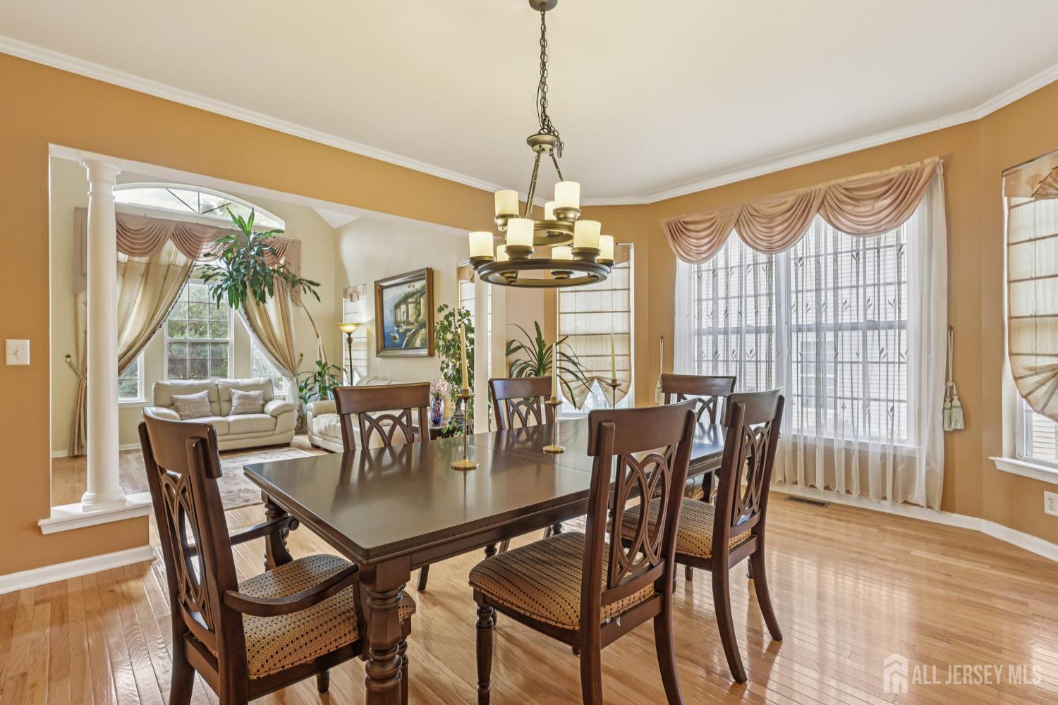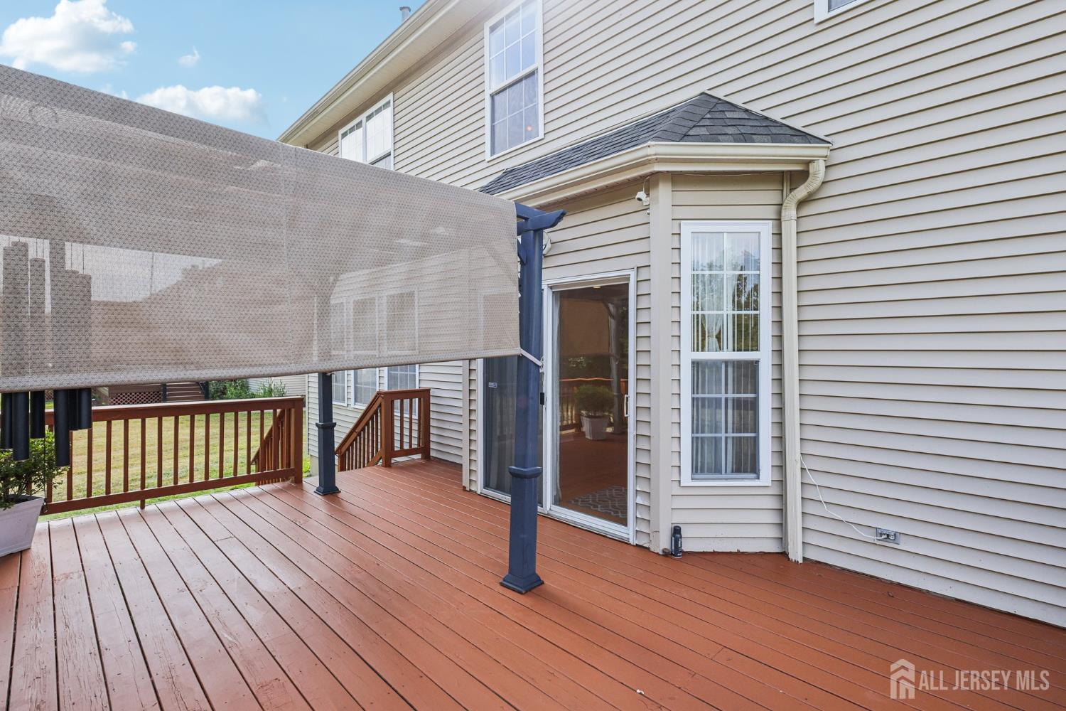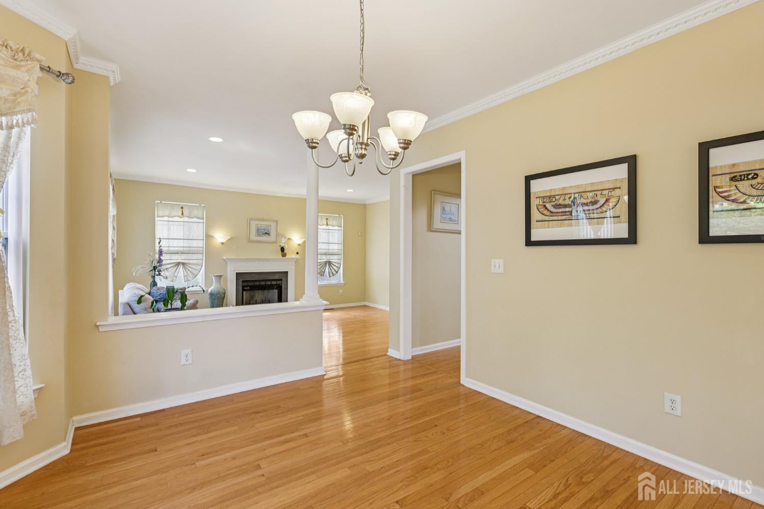 In the prestigious Apple Ridge Estates, discover an exceptional East Brunswick colonial boasting nearly 3,300 square feet of luxury living on a premium lot backing to tranquil conservation land. This estate features four spacious bedrooms upstairs along with a fifth bedroom option or office on the main level, complete with a full bath, ideal for multi-generational living or guest accommodations. The grand two-story foyer, illuminated by an elegant chandelier, opens to a spectacular great room with cathedral ceilings that overlook the formal dining area. Beautiful custom wall niches with accent lighting, crown molding, and hardwood flooring throughout showcase the home's craftsmanship and attention to detail. The gourmet kitchen is appointed with granite countertops, 42-inch cabinets, and sliders that open to a park-like backyard featuring a deck and gazebo perfect for outdoor entertaining or quiet evenings surrounded by nature. Recent upgrades add tremendous value, including a brand-new HVAC system,furnace, and tankless hot water heater (2024), a new hardwood staircase(2024),new garage doors, and a 10-year-young roof. Additional features include a smart sprinkler system controller, an electric vehicle charging station with a Level 2 charger, and professionally designed landscaping that enhances the property's curb appeal. Upstairs, the expansive primary suite impresses with double walk-in closets and a sun-filled ensuite bath with a skylight. The full basement with upgraded high ceilings offers endless possibilities for future customization. Commuters will love the home's prime location with easy access to express buses to New York City and Jersey City, Route 18, Route 1, and the NJ Turnpike, this home is also close to Downtown New Brunswick, Rutgers University, major hospitals, shopping, and dining. Zoned for acclaimed East Brunswick Blue Ribbon School District. This luxurious home combines size, style, and location, offering unmatched value in one of East Brunswick's most desirable neighborhoods that will not last! CJMLS 2607015R
