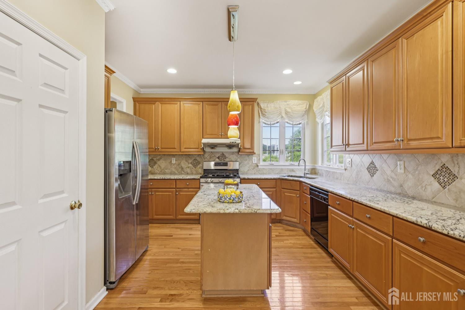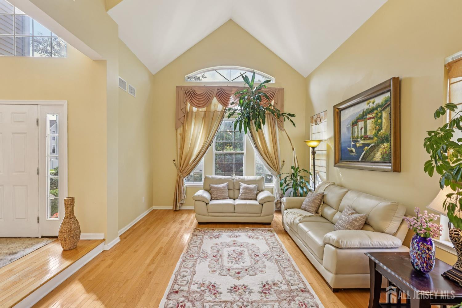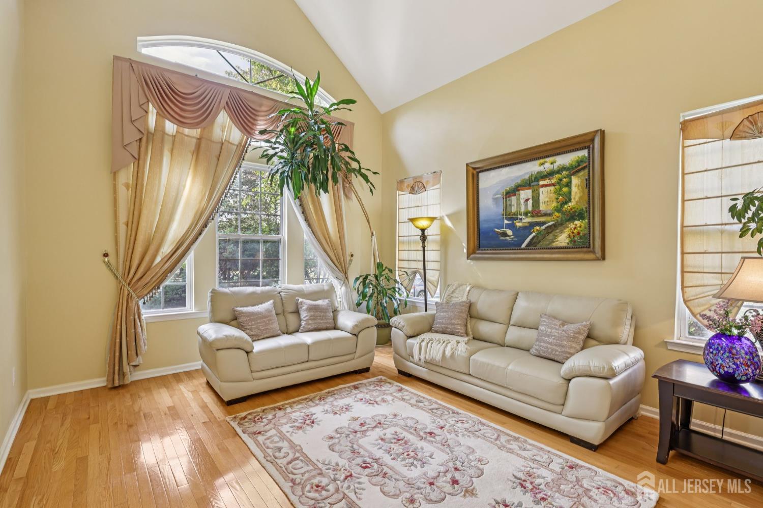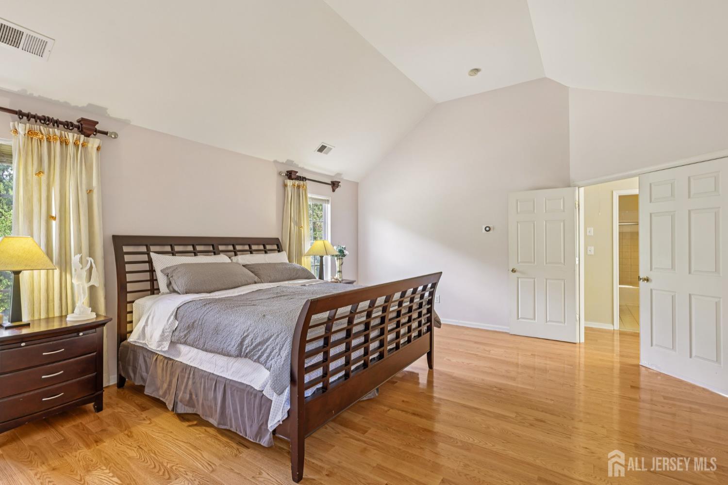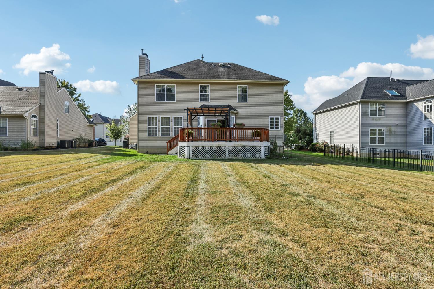 In the prestigious Apple Ridge Estates, discover an exceptional East Brunswick colonial boasting nearly 3,300 square feet of luxury living on a premium lot backing to tranquil conservation land. This estate features four spacious bedrooms upstairs along with a fifth bedroom option or office on the main level, complete with a full bath, ideal for multi-generational living or guest accommodations. The grand two-story foyer, illuminated by an elegant chandelier, opens to a spectacular great room with cathedral ceilings that overlook the formal dining area. Beautiful custom wall niches with accent lighting, crown molding, and hardwood flooring throughout showcase the home's craftsmanship and attention to detail. The gourmet kitchen is appointed with granite countertops, 42-inch cabinets, and sliders that open to a park-like backyard featuring a deck and gazebo perfect for outdoor entertaining or quiet evenings surrounded by nature. Recent upgrades add tremendous value, including a brand-new HVAC system,furnace, and tankless hot water heater (2024), a new hardwood staircase(2024),new garage doors, and a 10-year-young roof. Additional features include a smart sprinkler system controller, an electric vehicle charging station with a Level 2 charger, and professionally designed landscaping that enhances the property's curb appeal. Upstairs, the expansive primary suite impresses with double walk-in closets and a sun-filled ensuite bath with a skylight. The full basement with upgraded high ceilings offers endless possibilities for future customization. Commuters will love the home's prime location with easy access to express buses to New York City and Jersey City, Route 18, Route 1, and the NJ Turnpike, this home is also close to Downtown New Brunswick, Rutgers University, major hospitals, shopping, and dining. Zoned for acclaimed East Brunswick Blue Ribbon School District. This luxurious home combines size, style, and location, offering unmatched value in one of East Brunswick's most desirable neighborhoods that will not last! CJMLS 2607015R