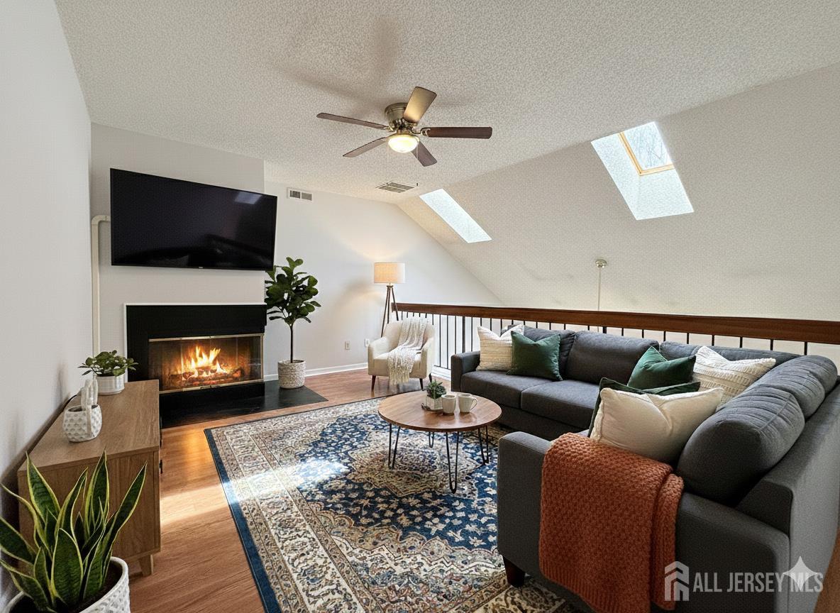 Welcome to this stunningly renovated, second-floor end-unit tucked away in the desirable Kingswood Station community. This home has been meticulously updated to offer a fresh, modern aesthetic combined with the ultimate in comfort. This light-filled home features vaulted ceilings with skylights, filling the space with natural sunlight. The open-concept living and dining area offers plenty of room for entertaining, while a sliding glass door leads to a balcony, ideal for morning coffee or evening unwinding. The kitchen offers generous counter space, perfect for preparing meals with ease. The well-appointed primary suite includes its own en-suite bathroom, while the comfortably sized second bedroom enjoys easy access to the main bath. Upstairs, a cozy loft with a fireplace creates an inviting retreat-great for reading, working, or simply relaxing. Enjoy a vibrant lifestyle with community amenities such as a clubhouse, basketball court, footpaths, outdoor swimming pool, tennis court, and playground - providing something for everyone to enjoy. One assigned parking spot is included. Perfectly situated just minutes from NYC-bound buses and major roadways, including Routes 18 & 1 and the NJ Turnpike, this home offers unbeatable commuter access. You're also close to Downtown New Brunswick, Rutgers University, renowned hospitals, and a variety of shopping, dining, and recreational destinations. All of this, plus proximity to Warnsdorfer Elementary School and East Brunswick's top-rated Blue Ribbon Schools, don't miss the chance to make this exceptional home your own! CJMLS 2610913R