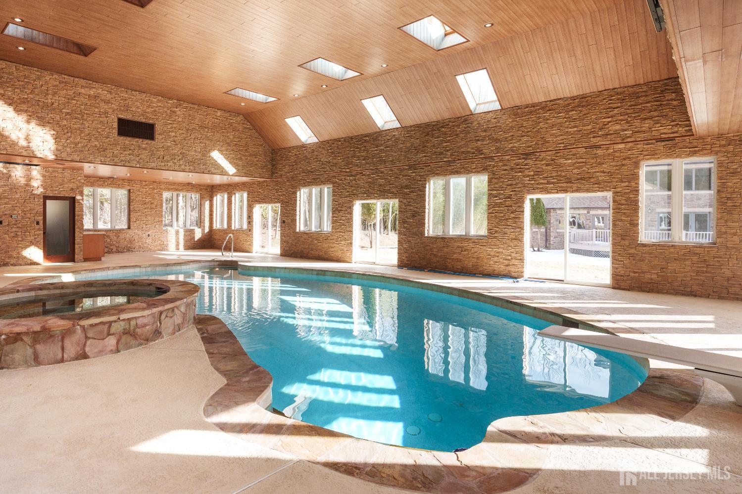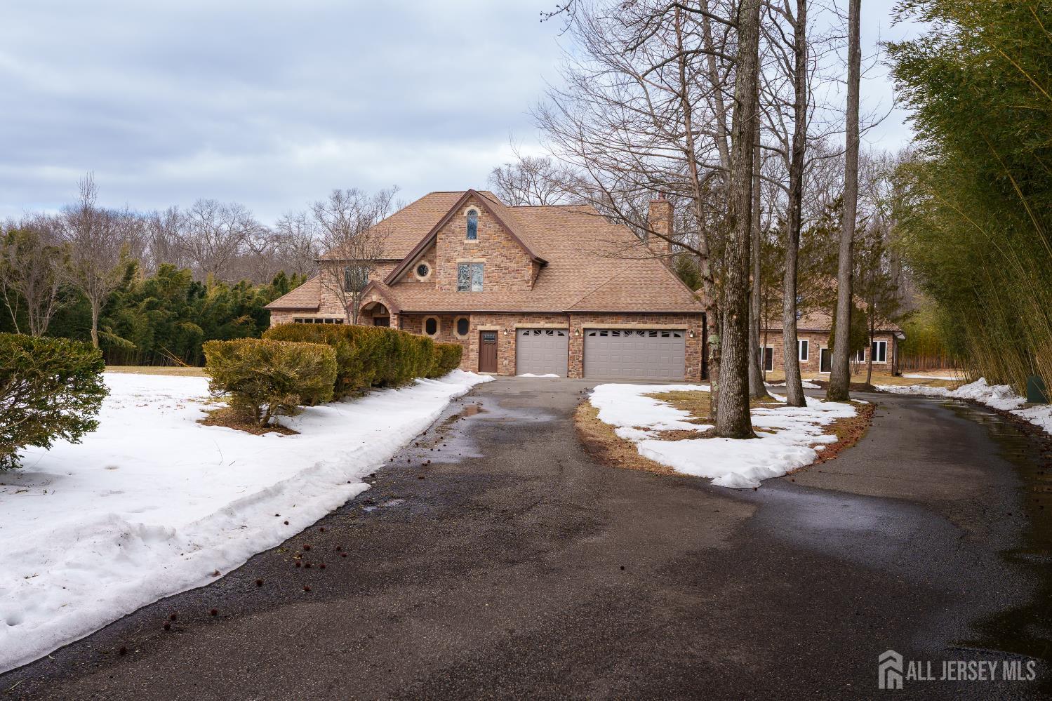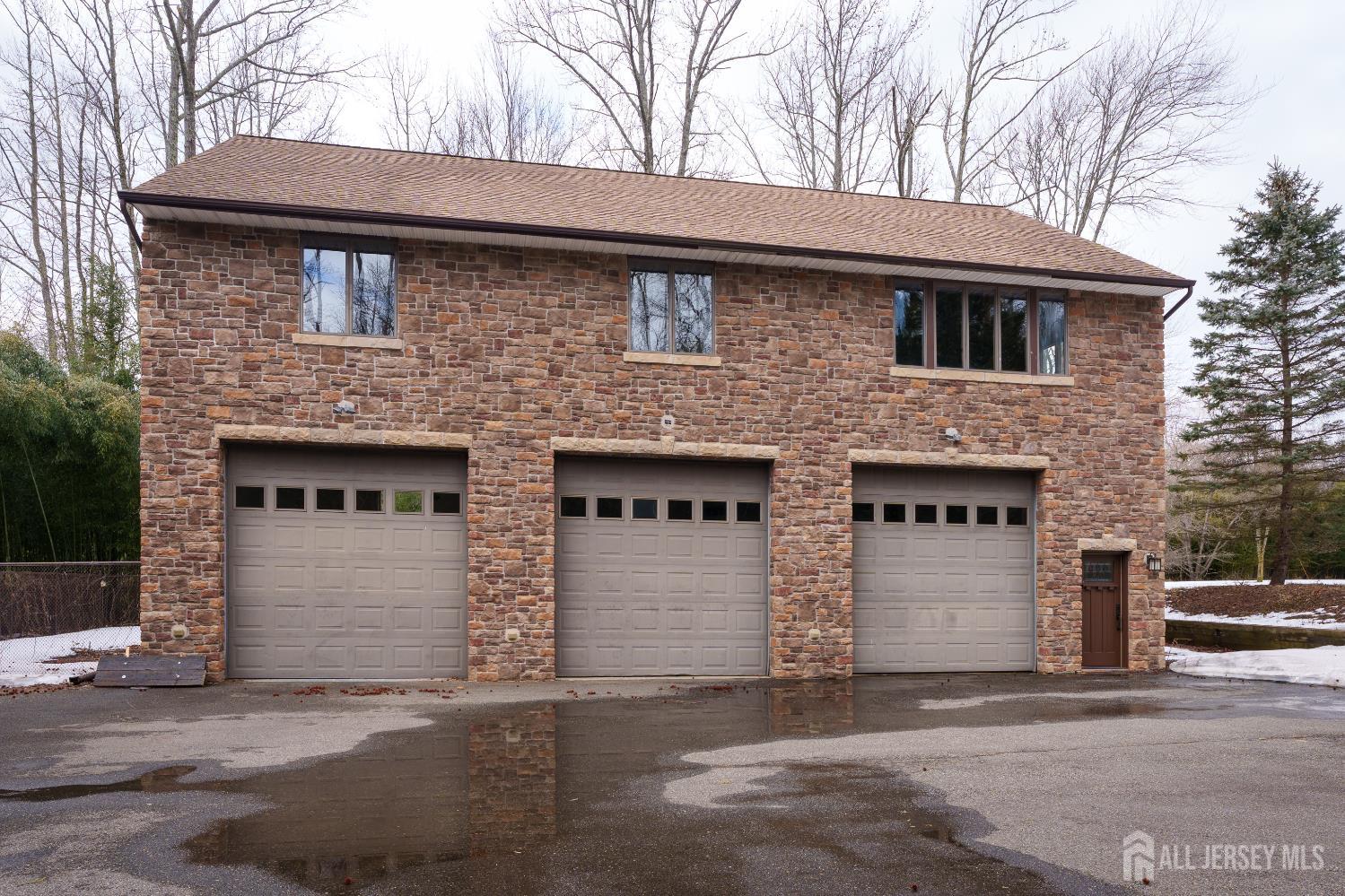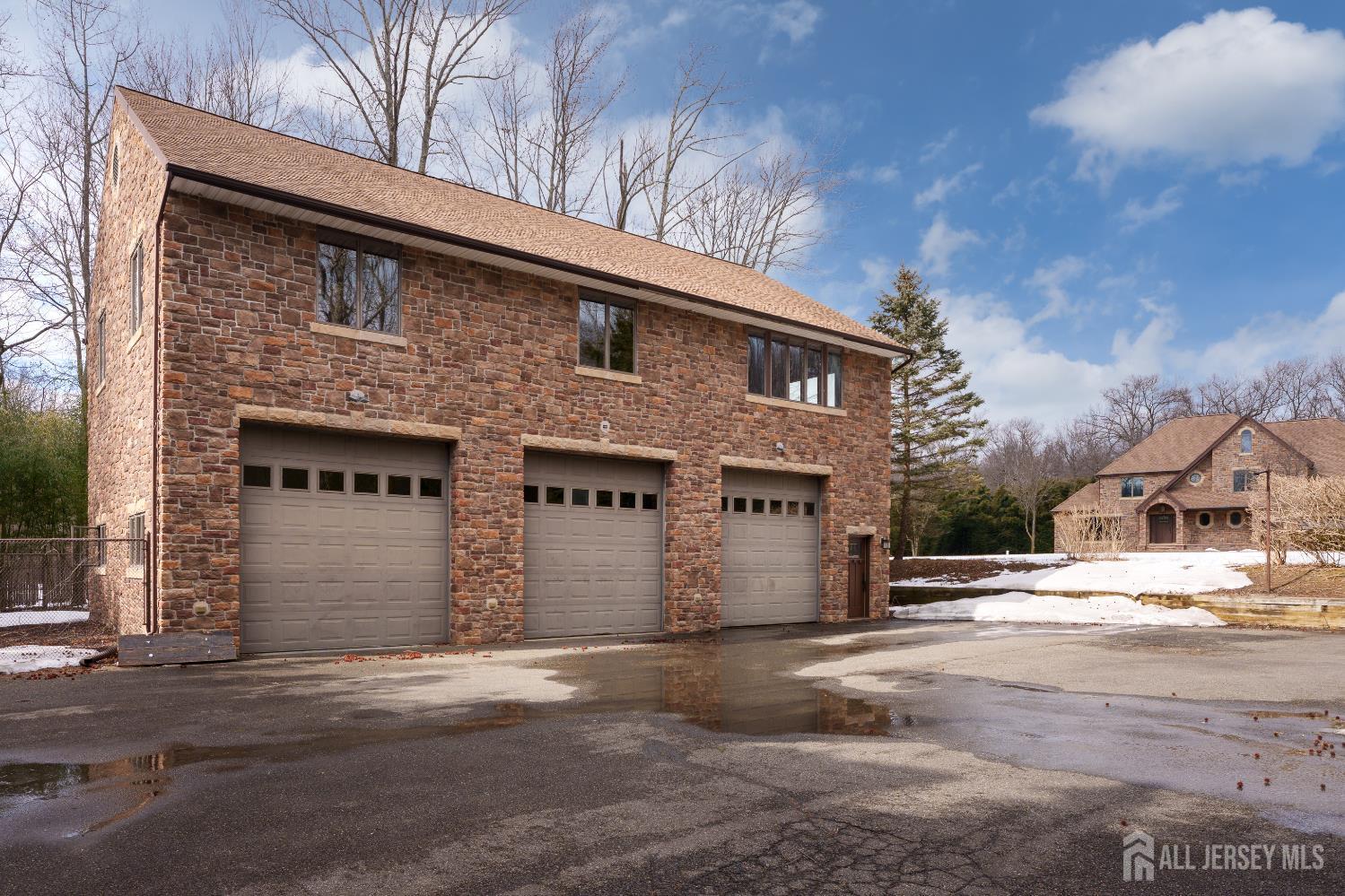If incredible craftsmanship, amenities beyond compare and versatile space for hobbies or work are non-negotiable, this gated 2.77-acre private estate, complete with an indoor pool and separate multi-car garage, leaves nothing to want! The main house features a stone exterior, setting the stage for extraordinary finishes within. Hardwood flooring spans the living and dining rooms, both infused with sunlight. The custom cherry-wood kitchen comes equipped with chef-level appliances by Sub-Zero, Wolf, Miele and Gaggeneau, including an integrated air fryer and steamer. Oversized porcelain flooring extends into the adjoining family room and serves as a bright contrast to more warm cherry walls, as well as a wood-burning fireplace. The main floor also has a tiled sunroom with a spa alcove and access to the deck. Three and a half bathrooms are each distinctly tiled and the primary bath also has a sauna and big tub that fills from above via a ceiling spout. A study leads to a freshly carpeted loft, while the basement offers a trio of finished spaces. Follow the stone path to a magnificent pool house with soaring skylights above a spectacular indoor gunite pool with spa, full bath and kitchenette, encouraging you to stay fit and have fun all year round! In addition to the attached three-car garage, a third stone-clad building on the property accommodates up to 6 vehicles with ease. Car enthusiasts might add a lift for even more functionality, while boat or RV owners can finally store their prized toys with space to spare. Above, a sprawling loft is partially finished, presenting the possibility of even more future living space. Treat yourself to a tour of this one-of-a-kind property to fully appreciate the vast amount of space and unheard-of versatility. CJMLS 2611957R
