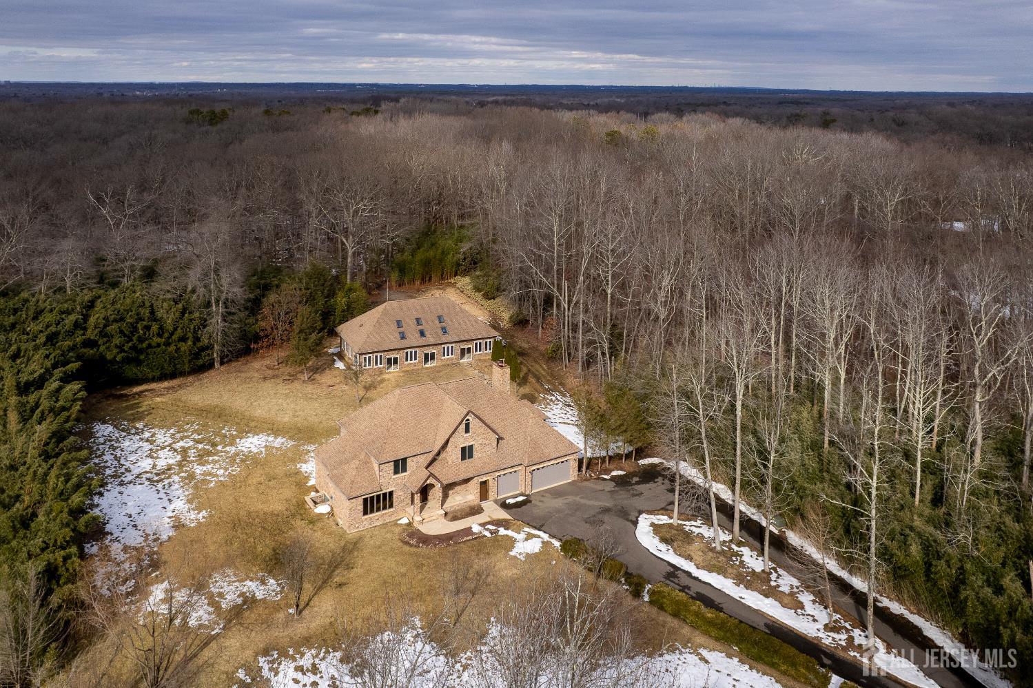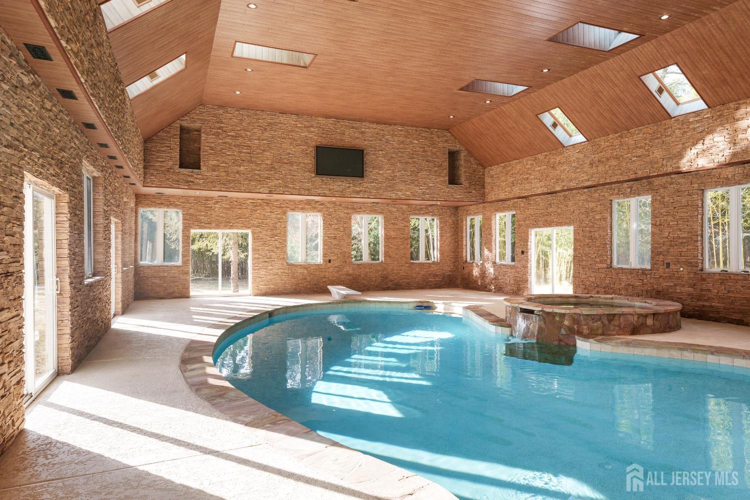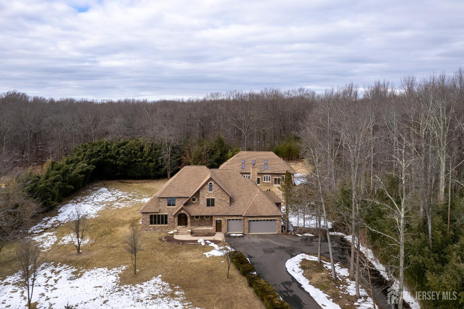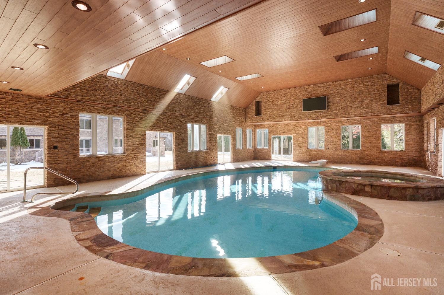 If incredible craftsmanship, amenities beyond compare and versatile space for hobbies or work are non-negotiable, this gated 2.77-acre private estate, complete with an indoor pool and separate multi-car garage, leaves nothing to want! The main house features a stone exterior, setting the stage for extraordinary finishes within. Hardwood flooring spans the living and dining rooms, both infused with sunlight. The custom cherry-wood kitchen comes equipped with chef-level appliances by Sub-Zero, Wolf, Miele and Gaggeneau, including an integrated air fryer and steamer. Oversized porcelain flooring extends into the adjoining family room and serves as a bright contrast to more warm cherry walls, as well as a wood-burning fireplace. The main floor also has a tiled sunroom with a spa alcove and access to the deck. Three and a half bathrooms are each distinctly tiled and the primary bath also has a sauna and big tub that fills from above via a ceiling spout. A study leads to a freshly carpeted loft, while the basement offers a trio of finished spaces. Follow the stone path to a magnificent pool house with soaring skylights above a spectacular indoor gunite pool with spa, full bath and kitchenette, encouraging you to stay fit and have fun all year round! In addition to the attached three-car garage, a third stone-clad building on the property accommodates up to 6 vehicles with ease. Car enthusiasts might add a lift for even more functionality, while boat or RV owners can finally store their prized toys with space to spare. Above, a sprawling loft is partially finished, presenting the possibility of even more future living space. Treat yourself to a tour of this one-of-a-kind property to fully appreciate the vast amount of space and unheard-of versatility. CJMLS 2611957R