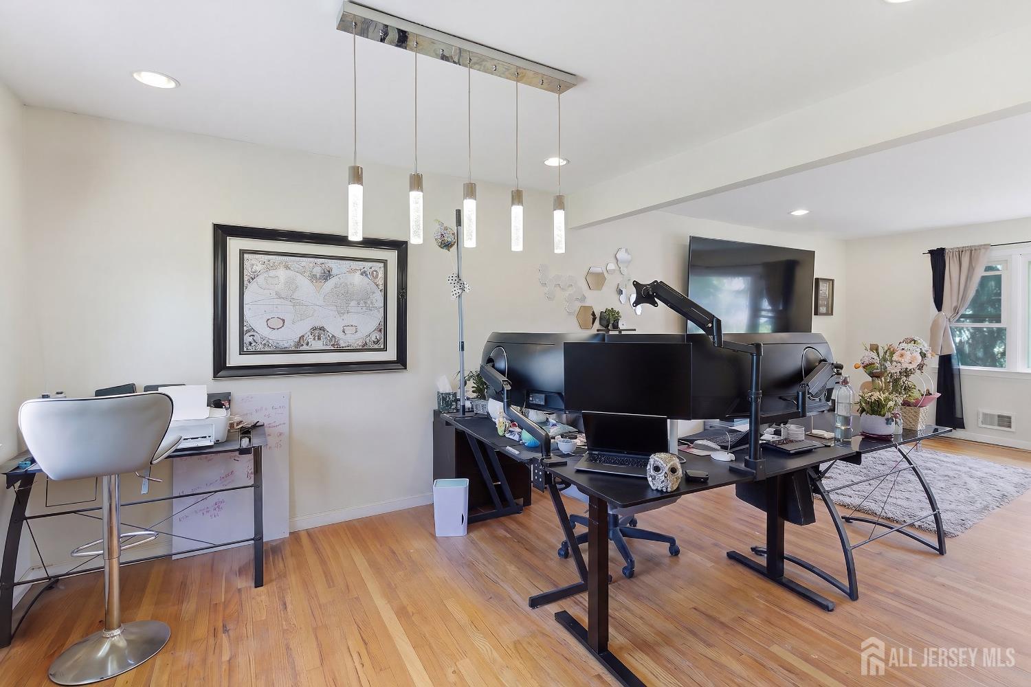 Welcome to this rare opportunity to own a spacious 6-bedroom, 2 full bath bi-level home in the desirable community of North Brunswick. Offering a versatile layout and generous living space, this home is ideal for those seeking room to grow, entertain, or accommodate multi-generational living. Upon entry, head upstairs to the main level where you are greeted by an open concept design complemented by beautiful hardwood flooring throughout. To the right of the staircase is a large living room filled with natural light from oversized windows, creating a bright and inviting atmosphere. The living room flows seamlessly into a spacious dining area, perfect for hosting gatherings. Just off the living and dining rooms is a well-appointed kitchen featuring stainless steel appliances, granite countertops, tile backsplash, and ample cabinet space, along with room for a breakfast table to create an eat-in kitchen setup. Down the hallway are three well-sized bedrooms. The bedroom at the end of the hall offers convenient access to the shared full bathroom, complete with a tub/shower combination. The lower level expands your living space even further. Enter through elegant glass French doors into an expansive family room, ideal for entertaining or relaxing. This level also features three additional bedrooms, including one converted from the original two-car garage, providing a generously sized bonus room. A second full bathroom with a shower stall and a dedicated laundry room add to the functionality of this floor. Sliding glass doors from the family room lead out to a private deck overlooking the fully fenced backyard, perfect for outdoor enjoyment. The yard also includes a storage shed for added convenience. The home offers a one-car garage along with an additional storage room, plus a double-wide driveway for ample parking. Conveniently located just a short drive to Routes 1 and 130 as well as the New Jersey Turnpike, this home is ideal for commuters while still offering the comfort of a residential neighborhood setting. CJMLS 2614240R