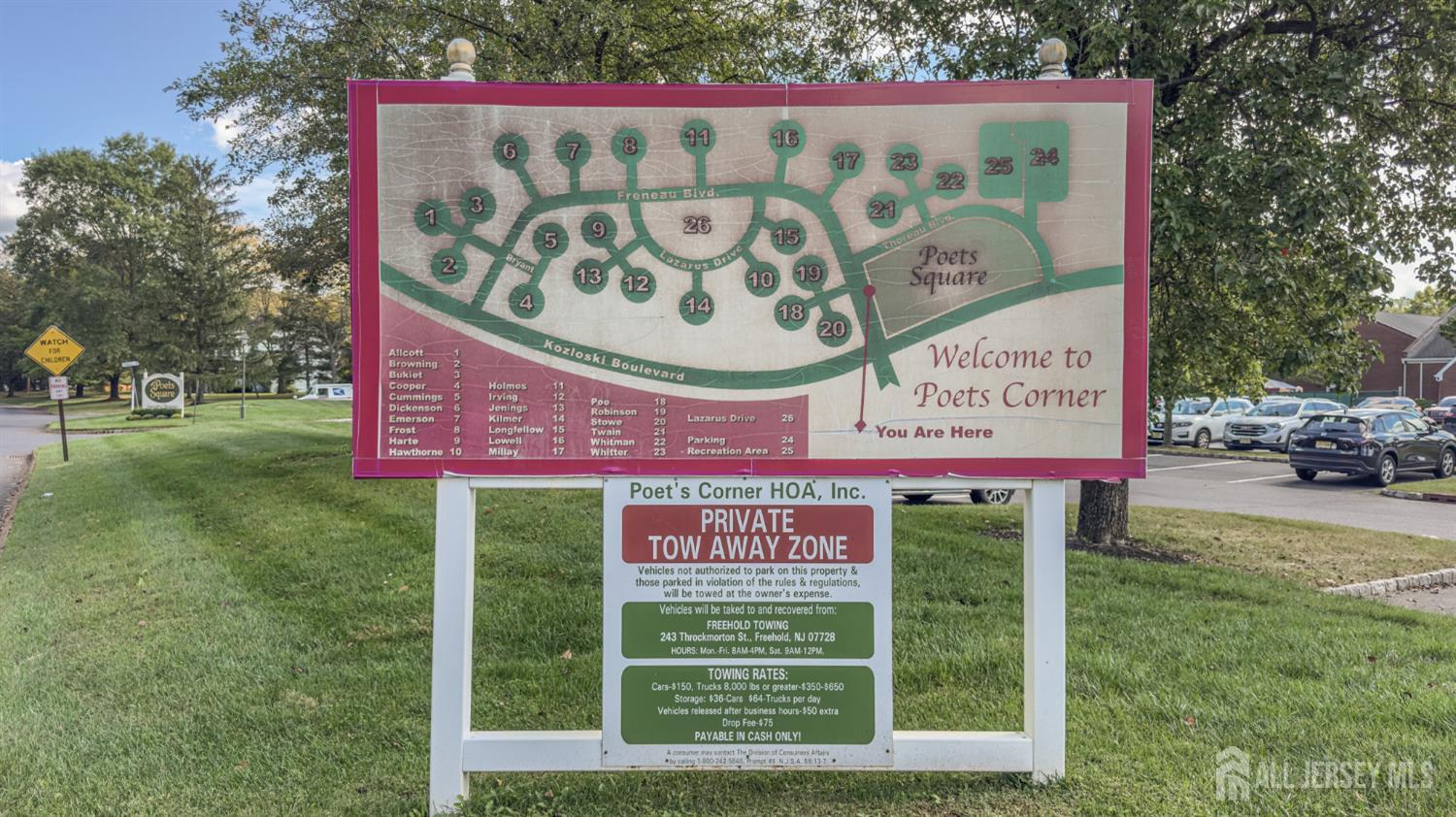 Freehold's sought after Poet's Corner Community premieres this beautifully updated 2 Bed 2.5 Bath Bath Townhome with dual Master Suites and 1 Car Garage, sure to impress! Well maintained with plenty of upgrades all through, completely move-in-ready and waiting for you! This charming unit offers a freshly painted interior with generous room sizes and plenty of natural light all through. Spacious, light and bright living room features a soaring vaulted ceiling that truly opens up the space, along with sliders to your own private patio, the perfect spot to enjoy your morning coffee. Kitchen offers sleek SS appliances, tiled flooring, and flows right into the charming dining area for easy entertaining. Newly remodeled guest bath and convenient in-unit laundry rounds out the main level of this gem. Upstairs, find both generously sized bedrooms with plush carpets, each with their own attached full baths. The master bedroom was newly painted in 2024, along with the newly remodeled luxe master bath. 1 car garage with driveway parking adds to the package, along with amenities such as the outdoor pool, tennis courts, and clubhouse. Gutter guards have been recently installed. Addtl upgrades inc: 2023 - replaced entry light fixture, kitchen light fixture, new door bell, removal of master BR closet doors, removed vents in LR wall, new door on utility closet with vents, replaced ceiling vents on all returns on the first floor, completed base trim on first floor. 2022 updates inc painted first floor and hallway, filled telephone jack, replaced all switches and outlets on first floor, replaced all light fixtures on first floor, replaced front door dead bolt and knob, painted the back patio light fixture, the list goes on! This is an excellent opportunity for the first time buyer, or a great rental property to add to your portfolio. Don't miss out! *Coming Soon - Showings begin Saturday 10/2* CJMLS 2605112R
