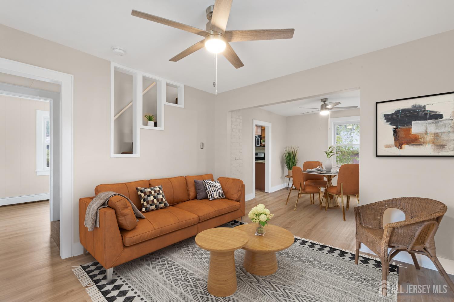 Available Soon! Welcome to this beautifully updated 4-bedroom, 2-bath Colonial, perfectly situated on a quiet corner lot in Middlesex, New Jersey. From the charming covered rocking chair porch to the thoughtfully designed interior, this home offers a seamless blend of comfort, character, and modern updates. Step inside to discover new flooring and fresh paint throughout, creating a bright and inviting atmosphere. The spacious kitchen has been tastefully renovated with custom cabinetry and abundant counter space, flowing effortlessly into the combined dining and living room ideal for entertaining or everyday gatherings. A versatile first-floor bedroom provides flexibility, whether as a private home office, guest retreat, or playroom. Upstairs, three additional bedrooms, including a generous primary, ensure space for everyone. Both bathrooms have been beautifully updated with stylish finishes, while ceiling fans add to the home's everyday comfort. Outdoors, the peaceful corner lot offers room to relax, garden, or entertain. The property also features a large shed with new flooring, offering excellent storage and the possibility of conversion into a garage with the right contractor. This move-in-ready Colonial is a perfect balance of timeless charm and modern convenience exceptional opportunity to call Middlesex home. CJMLS 2605558R