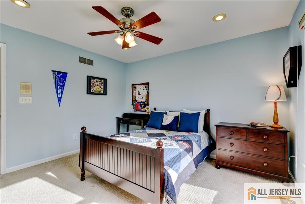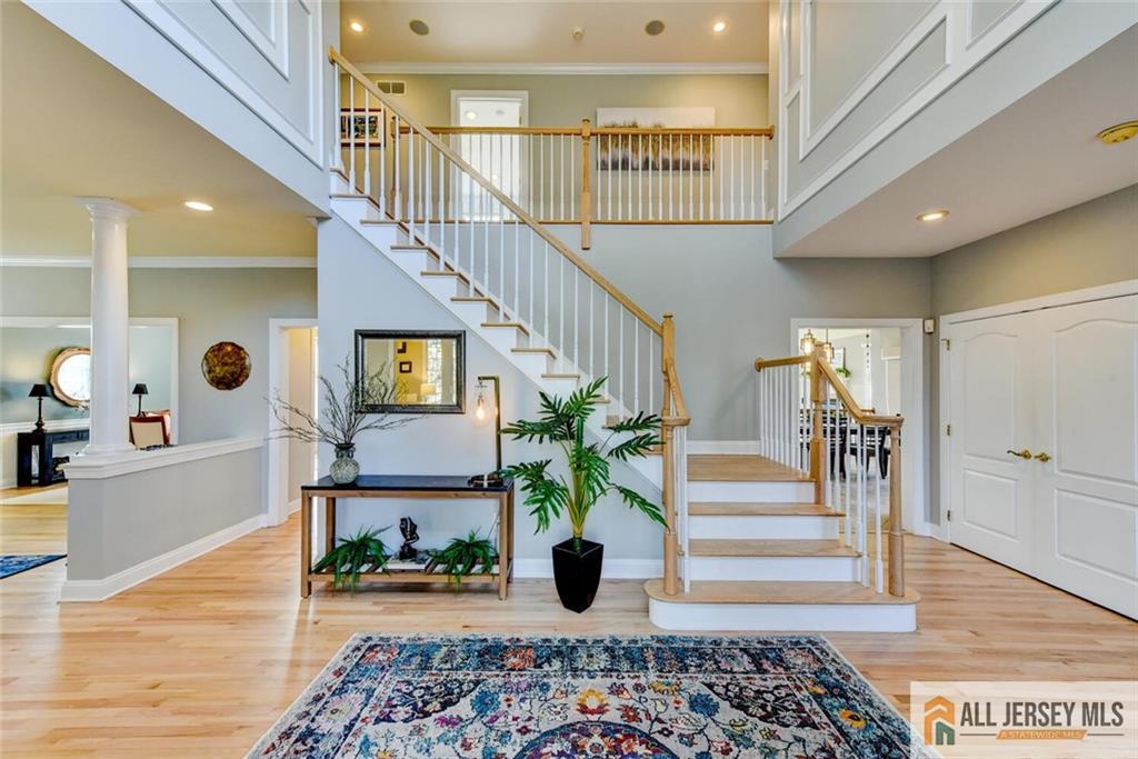 EAST-FACING and meticulously maintained, this exceptional home at 4 Stone Meadow Court offers the perfect blend of elegance, functionality, and modern upgrades in one of Plainsboro's most desirable locations. With thoughtfully designed living spaces, high-end finishes, and an impressive finished basement, this home delivers luxury living at every turn. A warm, welcoming exterior features professional landscaping, a light brick faade, and a custom paver walkway leading to the front entrance. Inside, gleaming hardwood floors flow throughout the main level and continue up the primary staircase, setting the tone for the refined interior. The formal living room is enhanced by decorative columns and crown molding, while the adjacent dining room features chair rail detailing, crown molding, and an elegant five-light chandelierperfect for entertaining. The heart of the home is the sun-filled, open-concept kitchen and family room. The beautifully updated gourmet kitchen boasts newer stainless steel appliances (2017), granite countertops, a complementary tile backsplash, modern lighting, and a large center island. A spacious eat-in area overlooks the backyard and opens to a custom paver patio through sliding glass doors. The adjoining family room is a true showstopper, with its vaulted ceiling, skylights, oversized Palladian window, and gas fireplace with a wood surround, creating a bright yet cozy gathering space. The first floor also offers exceptional versatility with a private office and a convenient in-law suite with a full bathroom, ideal for guests or multi-generational living. A whole-house speaker system adds to the home's modern appeal. Upstairs, the luxurious primary suite is a private retreat featuring a tray ceiling, a separate sitting room with hardwood flooring and a skylight, and a generous walk-in closet. The spa-like en-suite bath features a dual-sink vanity, a Jacuzzi whirlpool tub, and a glass-enclosed shower. Bedrooms 2 and 3 share a Jack-and-Jill bath with dual sinks, while Bedroom 4 is a princess suite with its own updated full bath. A large bonus room offers flexible space for a fifth bedroom, a playroom, or a home gym. The fully finished basementoffering approximately 2,500 square feet of additional living spacetruly sets this home apart. Designed for entertaining and extended living, it features distinct areas separated by decorative columns, including a large recreation space, a full modern kitchen, a living area with a brick accent niche, a full bar with a brick backsplash, a wine refrigerator, and a gas fireplace with a brick surround. A bonus room, full bath, and abundant storage complete this incredible level. Located within the highly rated West Windsor-Plainsboro School District and just 3 miles (approximately 7 minutes) to the Princeton Junction train station, this home is a commuter's dream. Enjoy easy access to major highways and nearby shopping, dining, and entertainment. CJMLS 2661584M
