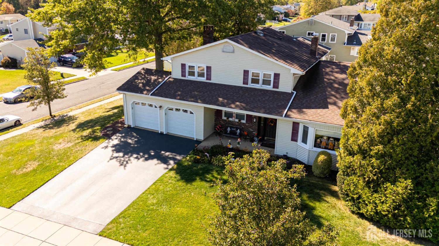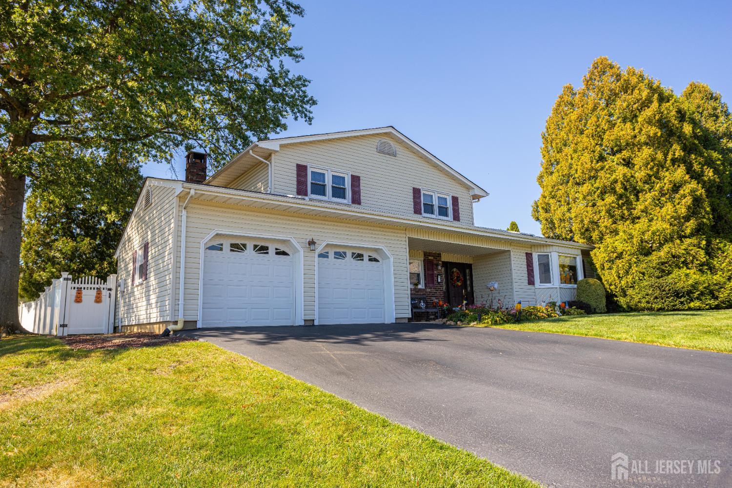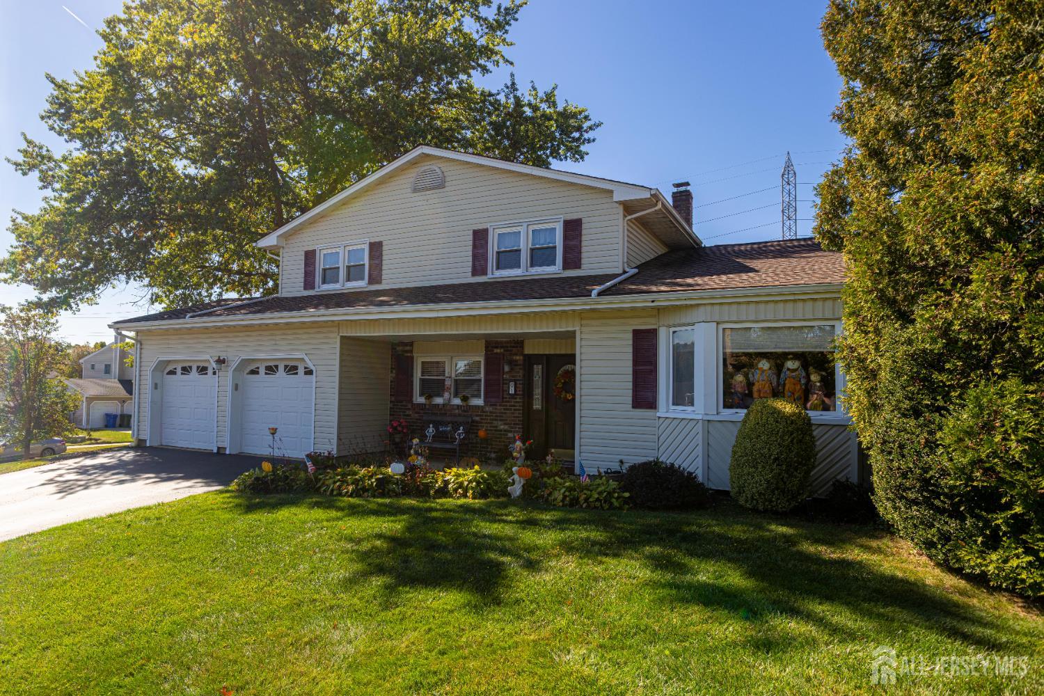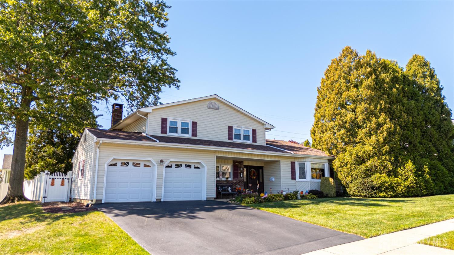 Welcome to this beautifully maintained 4-bedroom split level home situated on a corner lot in desirable Oak Tree West Development*This home features a charming brick front with vinyl siding and a 6-zone front sprinkler system. The roof was replaced in 2016, and recent updates include a newer HWH, gutters, and copper pipes in basement. Enjoy outdoor living in the private backyard featuring a 15 x 24 above-ground pool, a spacious patio with a large pergola, and a brand new white vinyl fence. Inside the home offers a bright living and dining room* Beautiful Eat in Kitchen with wood cabinets, all appliances stay. Bow window in living with vaulted ceilings with beautiful Hardwood floors, complemented by a cozy family room with a brick wood burning fireplace and sliders leading to the outside patio. The main bathroom was completely renovated in 2024 with double sinks, ceramic tile walls and vinyl flooring. The primary bedroom includes a half bath and a walk-in closet. Additional highlights include a mix of 1 full and 2 half baths with a functional layout perfect for both relaxation and entertaining! A must-see home! Showing start Friday Oct 10 CJMLS 2605514R