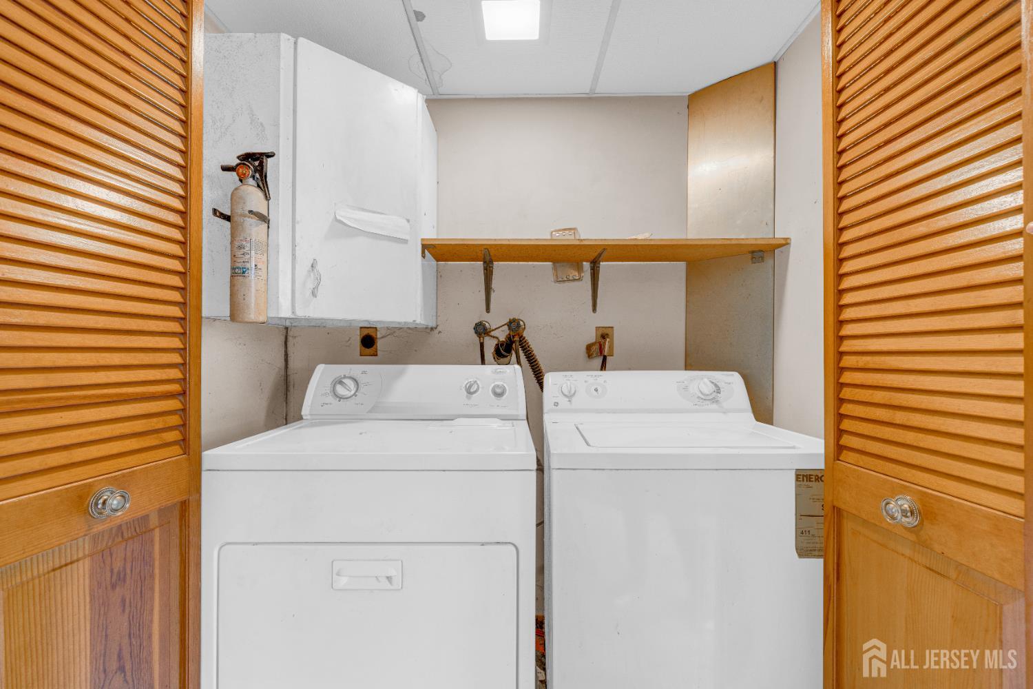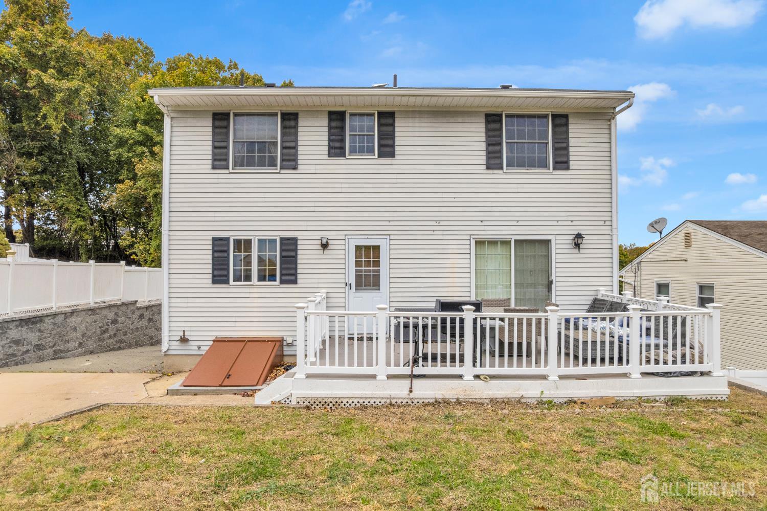 Welcome to 523 Leffert Street, a beautiful Colonial perched on a quiet dead-end street at the top of the hill, offering water views from the front porch and two of the bedrooms. As you enter through the front door, you're greeted by a slate-tile foyer with laminate flooring throughout the main level and ceramic tile in the kitchen and baths. The home features a formal front dining room with a bow window, and a front living room that also has a bow window allowing for great natural light. Toward the rear of the home, you'll find a spacious family room with sliding glass doors leading to a Trex-style deck overlooking the backyard. The eat-in kitchen includes gas oven, dishwasher, refrigerator, and washer/dryer, all sold as-is. There is a half bath on the first level for added convenience. Upstairs, the center-hall layout leads to 4 comfortable bedrooms. The primary bedroom offers two double-door closets, a full ensuite bath with separate shower stall and soaking tub, and linen closet for extra storage. On a clear day there are water views from a couple windows on the second floor and the front porch. The front-left bedroom includes an oversized closet. All bedrooms are carpeted. A door leads down to the full basement, which features high ceilings, offering plenty of potential. The basement includes a new Bilco door and new steps to the backyard. This home comes equipped with a central vacuum system (condition unknown), forced hot air furnace (as-is), and 200-amp electrical service. The central air is not currently operational. The basement also includes metal drawers and additional storage that will stay with the home. The backyard is spacious with a Trex-style deck, plastic storage shed (included), and new retaining walls on both sides of the property. The driveway is long enough to fit 3-4 cars comfortably. Built in 1987, this home has been lovingly maintained and offers great potential for updates to make it your own. Enjoy a peaceful setting with beautiful views, great outdoor space, and proximity to shopping, transportation, and waterfront recreationall in the desirable South Amboy community. This is an estate sale. As-is. Seller will obtain CO. The home does need some TLC. CJMLS 2606718R
