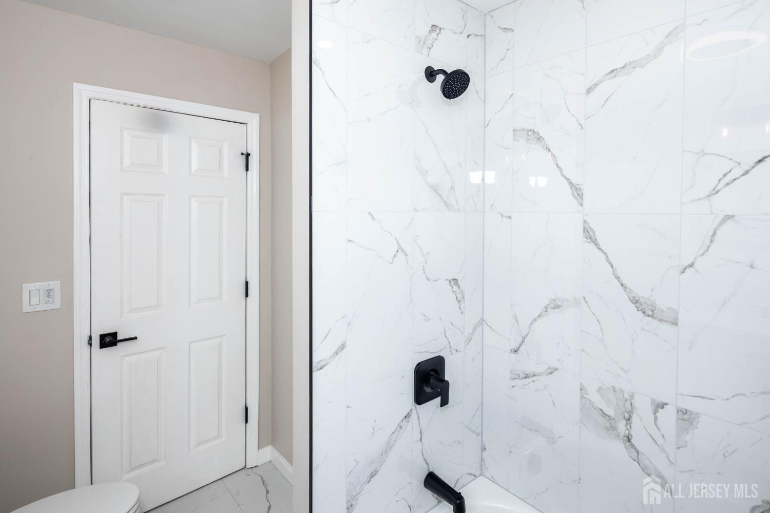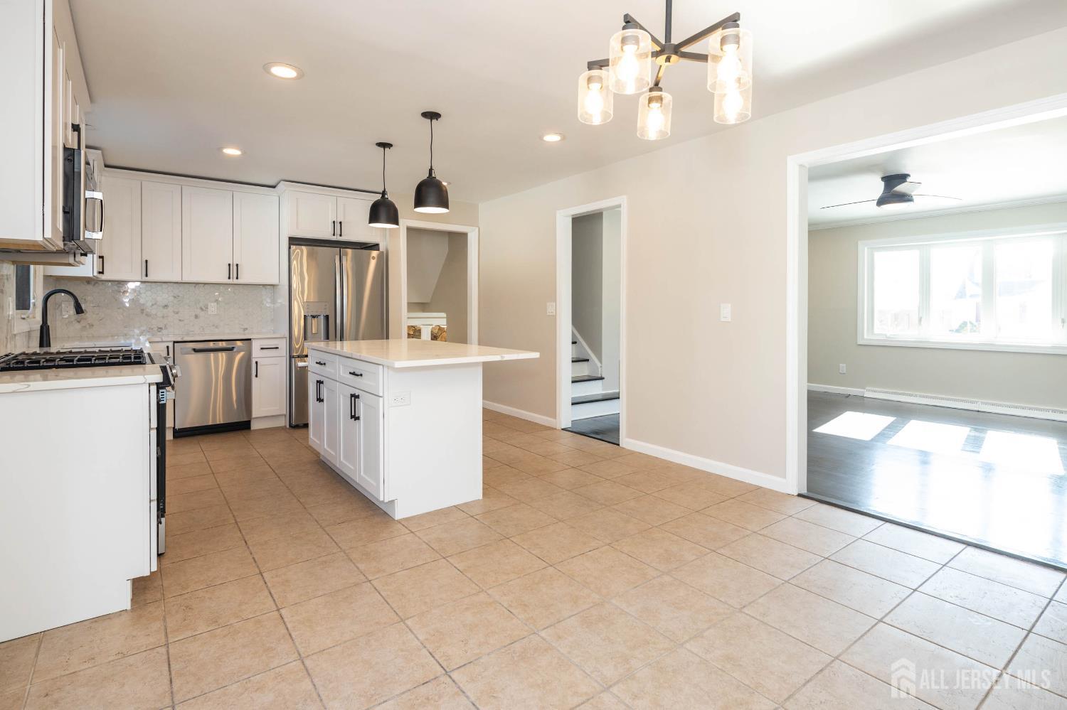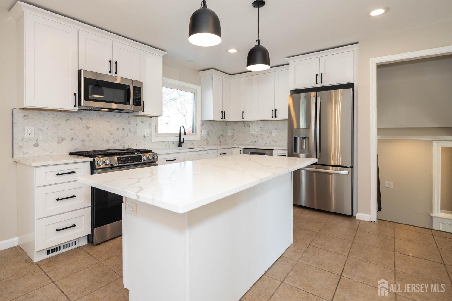 Best of both worlds with a suburban feel, on a quiet street and with off-street parking yet just over a 1/2 mile from the train station and under 1 mile to the ferry terminal! Welcome your guests into the foyer with its large format tile floor, crown molding & oversized jacket closet. The 1st floor also features a family room with gas fireplace, recessed lighting, ceiling fan and new Pergo wide LVP flooring along with a powder room and a spacious laundry room / mud room that leads out to the yard. Head up to the main level and entertain in your open kitchen / dining room combo with tons of space in the new cabinets, Quartz counters, tiled backsplash, LG stainless steel appliances (DR / Microwave / French Door Refrigerator and Slide-In Gas Range w/ Griddle and Air Fryer feature) and a center island with seating at the breakfast bar. The dining room area features sliding glass doors to a freshly painted deck which then leads down to a paver block patio. The living room with bay window and crown molding flows into both the kitchen and dining area. The home is completed with 3 bedrooms and a brand new bathroom on the upper level. The hardwood flooring in the LR and Bedrooms has just been refinished. Freshly painted interior including the basement which provides tons of storage along with the attic space. New light fixtures & door hardware provide finishing touches so you can enjoy your new home! Sellers are licensed real estate brokers in NJ. CJMLS 2610290R