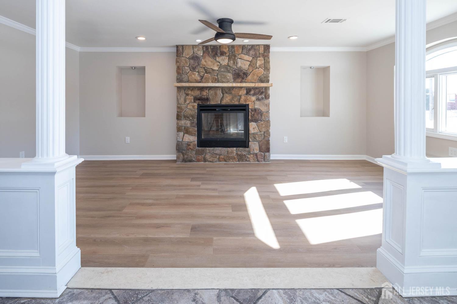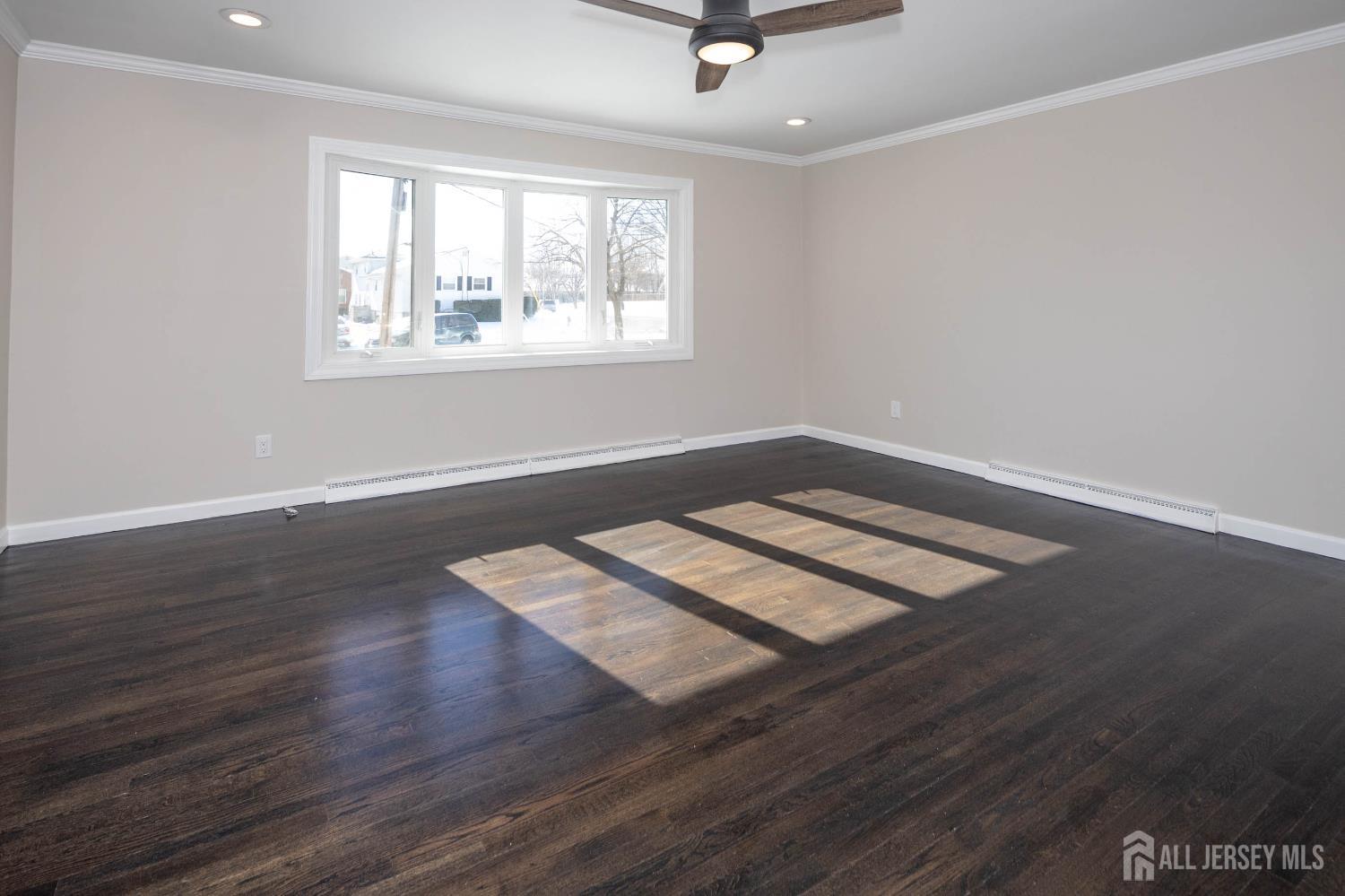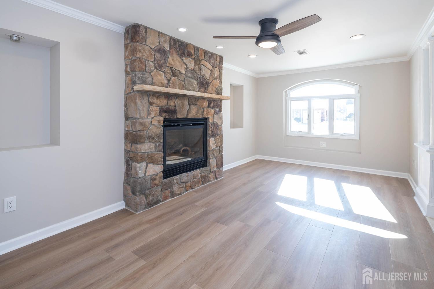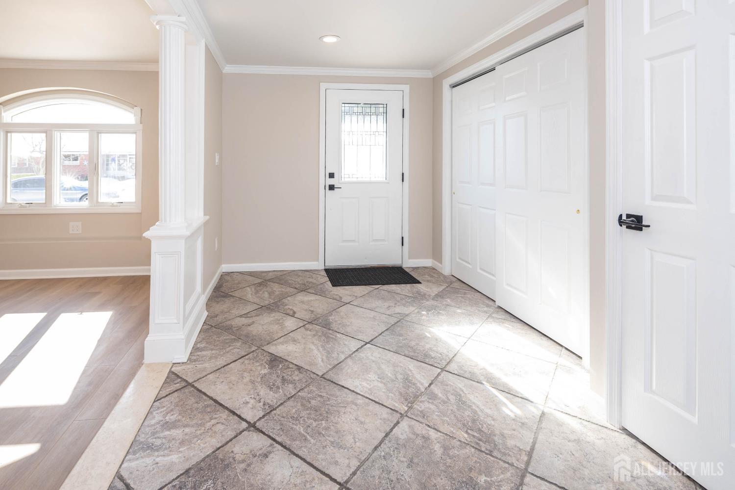Best of both worlds with a suburban feel, on a quiet street and with off-street parking yet just over a 1/2 mile from the train station and under 1 mile to the ferry terminal! Welcome your guests into the foyer with its large format tile floor, crown molding & oversized jacket closet. The 1st floor also features a family room with gas fireplace, recessed lighting, ceiling fan and new Pergo wide LVP flooring along with a powder room and a spacious laundry room / mud room that leads out to the yard. Head up to the main level and entertain in your open kitchen / dining room combo with tons of space in the new cabinets, Quartz counters, tiled backsplash, LG stainless steel appliances (DR / Microwave / French Door Refrigerator and Slide-In Gas Range w/ Griddle and Air Fryer feature) and a center island with seating at the breakfast bar. The dining room area features sliding glass doors to a freshly painted deck which then leads down to a paver block patio. The living room with bay window and crown molding flows into both the kitchen and dining area. The home is completed with 3 bedrooms and a brand new bathroom on the upper level. The hardwood flooring in the LR and Bedrooms has just been refinished. Freshly painted interior including the basement which provides tons of storage along with the attic space. New light fixtures & door hardware provide finishing touches so you can enjoy your new home! Sellers are licensed real estate brokers in NJ. CJMLS 2610290R